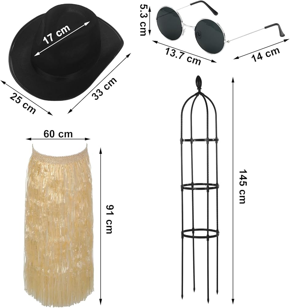 Rigorous Quality to Satisfy Diverse Require: these luau skirts are crafted from raffia that is fluffy, comfortable and long lasting, the sunglasses feature glass lenses for enhanced clarity and UV protection, the garden obelisk trellis is made from sturdy plastic to withstand outdoor elements, the bowler hat is constructed with nylon for durability and a sleek look