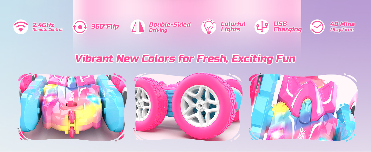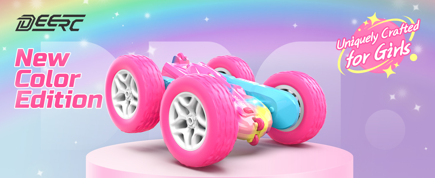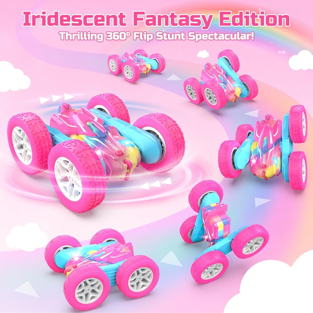 سيارة التحكم عن بعد بألوان قوس قزح من DEERC للفتيات، لعبة سيارات RC باللون الوردي مع أضواء LED، سيارة انجراف مزدوجة الجوانب بتردد 2.4 جيجا هرتز تدور بزاوية 360 درجة، هدية زاحفة RC لجميع التضاريس للأطفال، 40+ دقيقة من وقت التشغيل