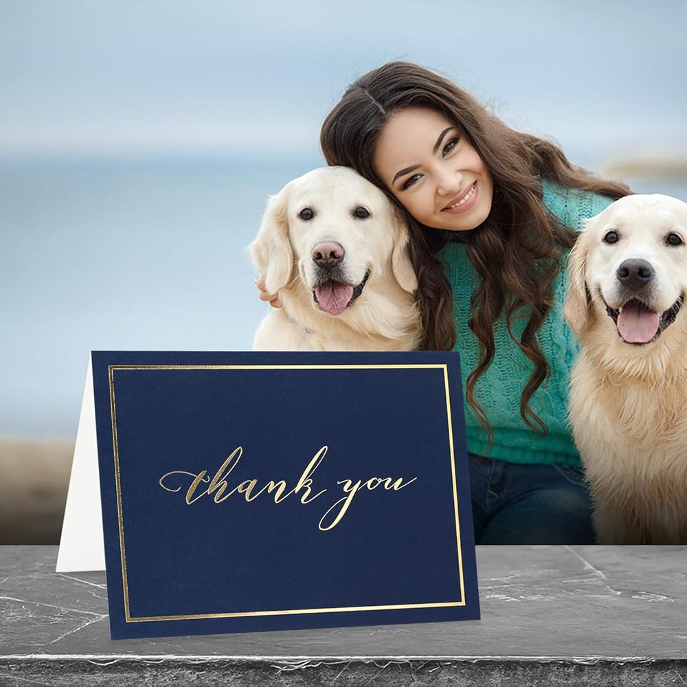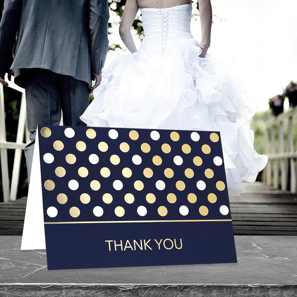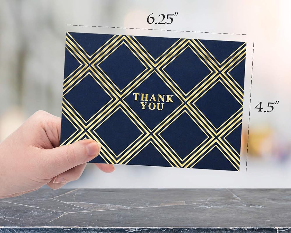 [مجموعة بطاقات شكر فريدة ومخصصة] أربع بطاقات تهنئة أنيقة بتصميم رقائق معدنية باللونين الأزرق الداكن والذهبي (بطاقات متنوعة، 25 من كل تصميم). توفر اللمسة النهائية المصنوعة من الرق ثقيل الوزن تباينًا مذهلاً مع النقش الذهبي الذي ينقل بمهارة الاحترافية والإخلاص.