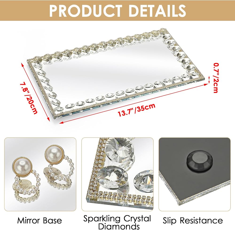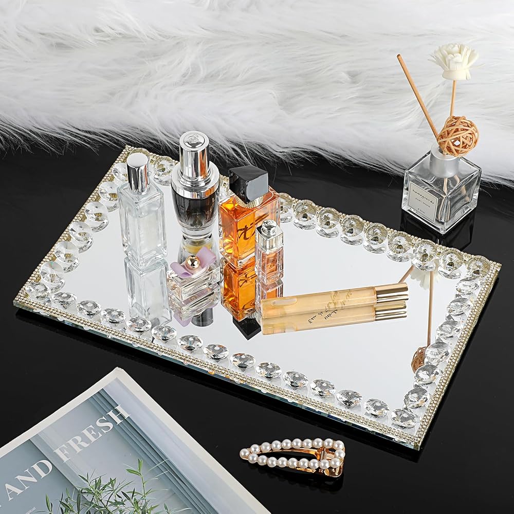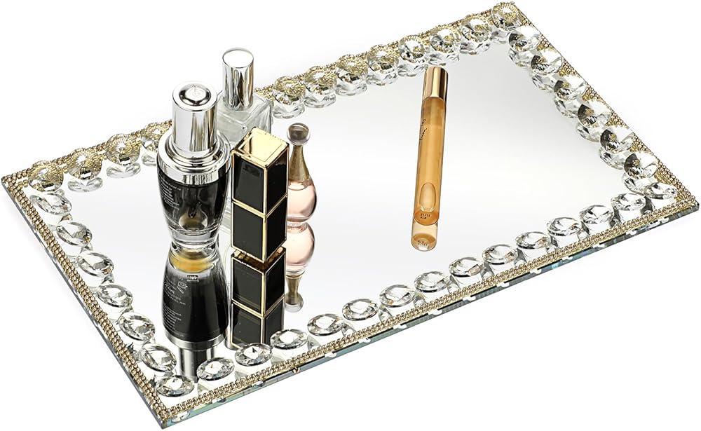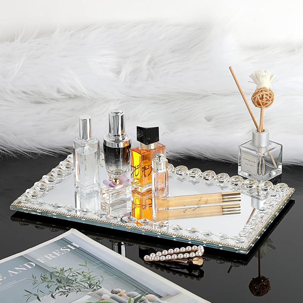 صينية كريستال أنيقة - تتميز صينية الزينة هذه بقاعدة مرآة رائعة مع زخرفة ماسية مطرزة متلألئة، وتبدو ناعمة ومشرقة، وتضيف لمسة من السحر الفريد إلى مساحتك، وتجعلها زخرفة لافتة للنظر على طاولة الزينة الخاصة بك