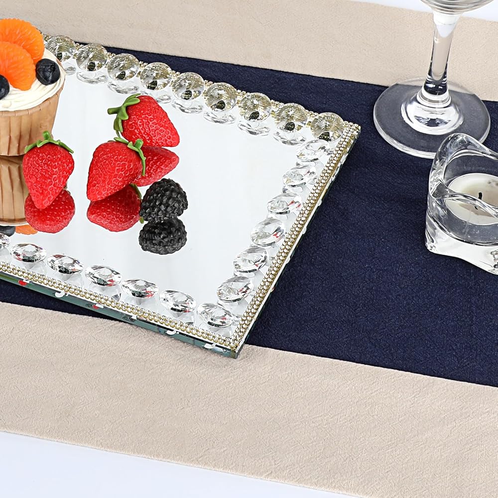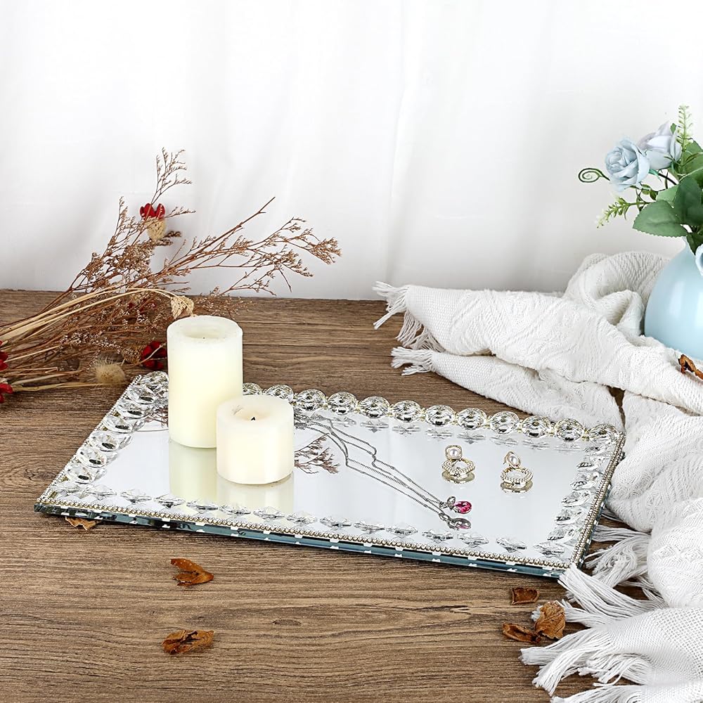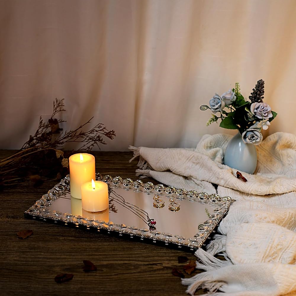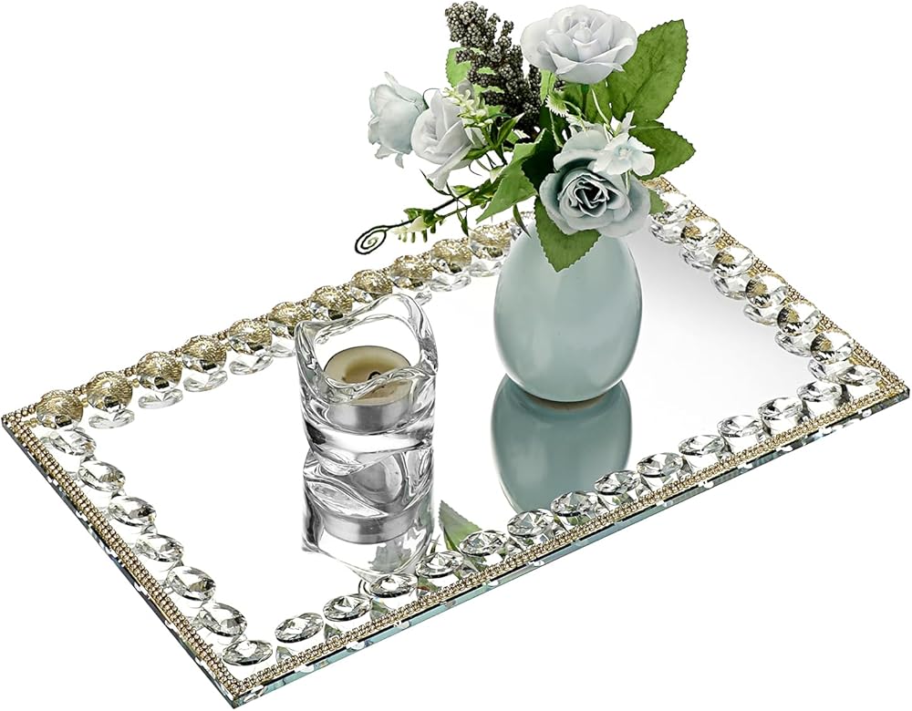 صينية كريستال أنيقة - تتميز صينية الزينة هذه بقاعدة مرآة رائعة مع زخرفة ماسية مطرزة متلألئة، وتبدو ناعمة ومشرقة، وتضيف لمسة من السحر الفريد إلى مساحتك، وتجعلها زخرفة لافتة للنظر على طاولة الزينة الخاصة بك