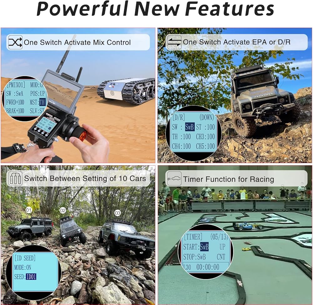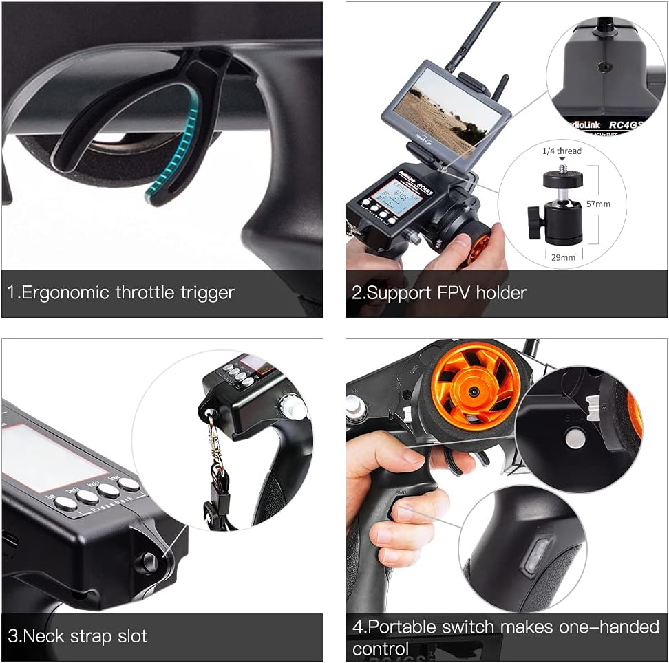 التوافق على نطاق واسع: وحدة التحكم عن بعد Radiolink RC4GS RC متوافقة مع جميع أنواع موديلات RC في السوق بما في ذلك زاحف الصخور RC والشاحنة الوحشية والانجراف وتعمل بالغاز والنيترو وسيارة RC والخزان والقارب وما إلى ذلك. أجهزة الاستقبال المتوافقة: R6FG/R6F/R4FGM/ أجهزة الاستقبال R8FG/R8FGH/R7FG.