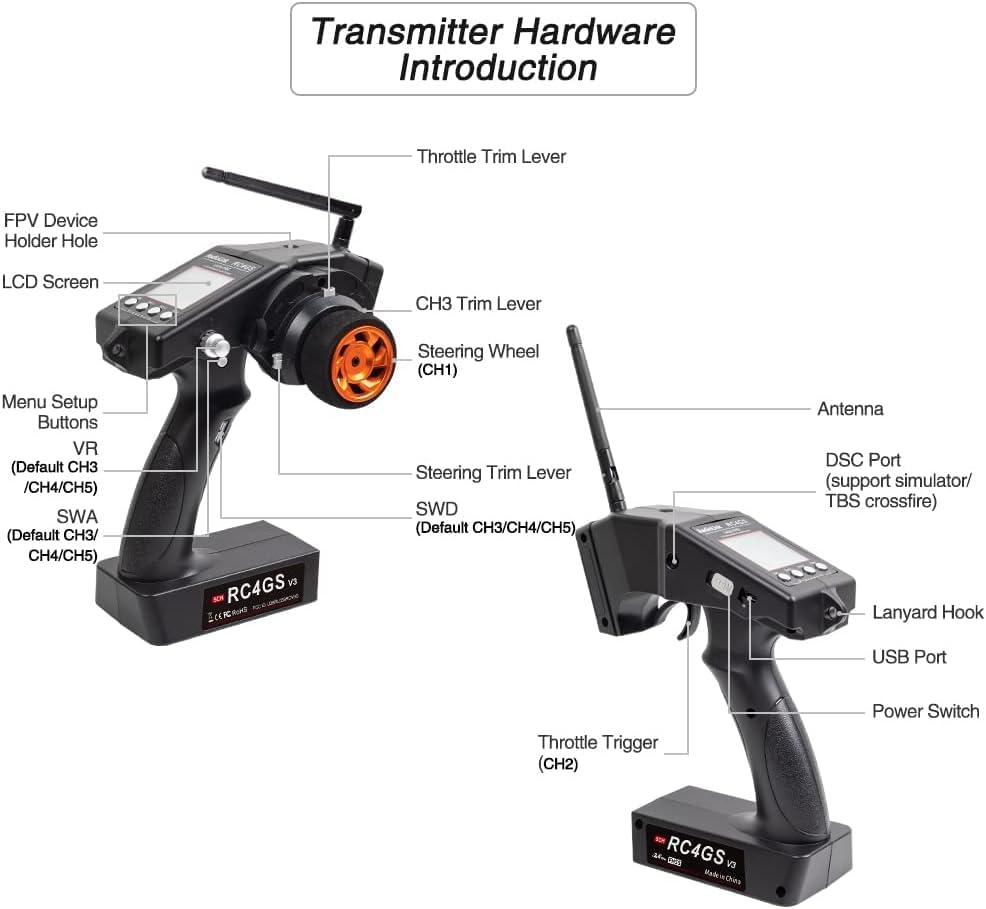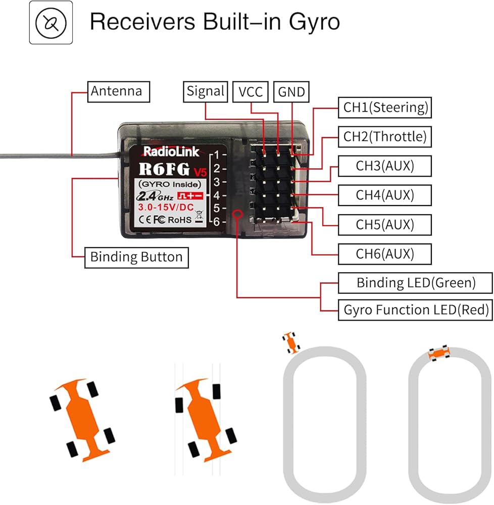 جيرو مدمج: جهاز إرسال واستقبال راديولينك RC4GS جيروسكوبي مدمج، وهو سهل التحكم في سيارتك والحفاظ على السيارة في خط مستقيم، يمكن تعديل حساسية الجيروسكوب عن طريق مفتاح الواقع الافتراضي لجهاز الإرسال، وتتحول السيارة بسلاسة أكبر، وتنجرف من يمكن منع السرعة العالية.