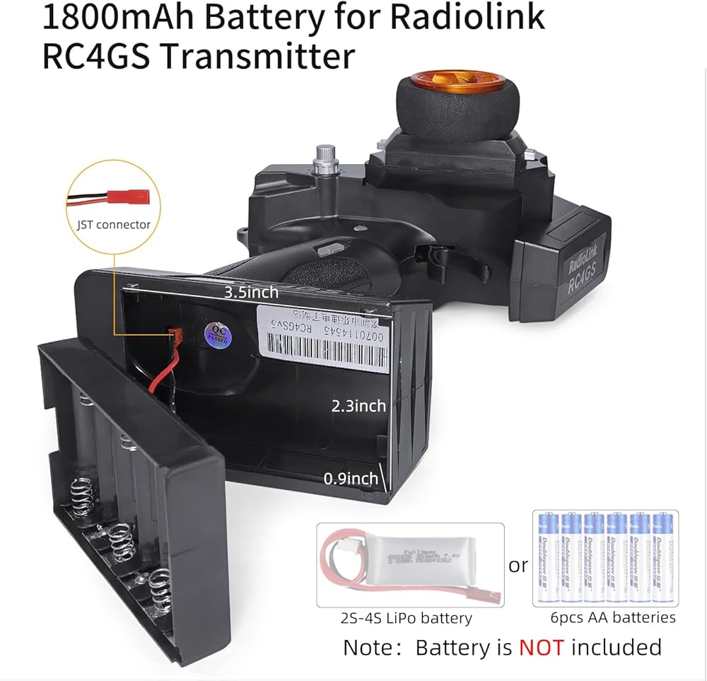 دائرة حماية القطبية العكسية: تقنية حماية التوصيل المضادة للقطبية ستحافظ على أمان جهاز الإرسال الخاص بك. لا يوجد تيار عند إدخال البطارية في الاتجاه المعاكس، فلا داعي للقلق بشأن إتلاف جهاز التحكم عن بعد. يدعم موصل JST بطاريات متعددة: 1*2S LiPo (متضمنة) أو 6*بطاريات جافة AA (غير متضمنة).