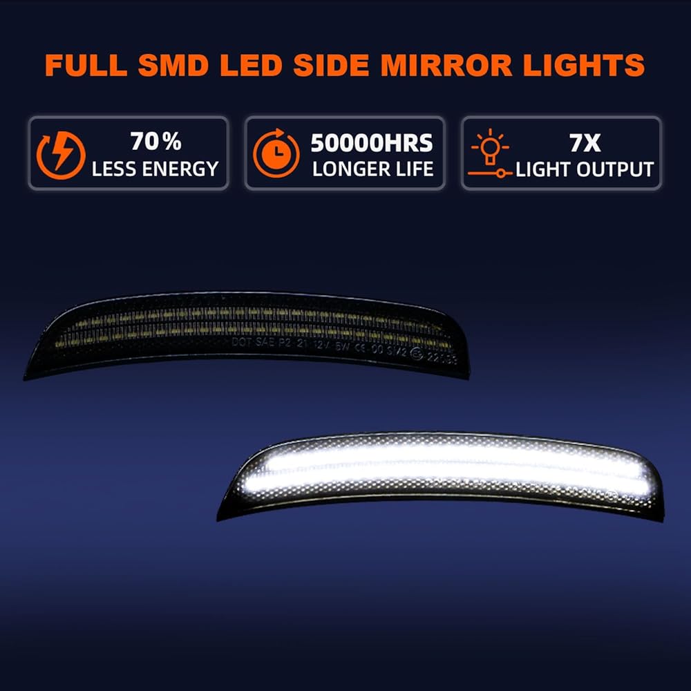 【تصميم مرآة مدخنة أكثر سطوعًا وأنيقًا بـ 7 مرات】يتم تثبيت 45 خرزة مصباح LED عالية الجودة في الأمام ونفس العدد في الخلف، مما يخلق تأثير إضاءة أكثر سطوعًا 7 مرات من الأضواء الأصلية. تصميم المرآة المدخنة الكلاسيكي لا يمنح سيارتك تجربة بصرية جديدة وعصرية فحسب، بل يتجاوز أيضًا معايير OEM من حيث المتانة ويطيل عمر الخدمة