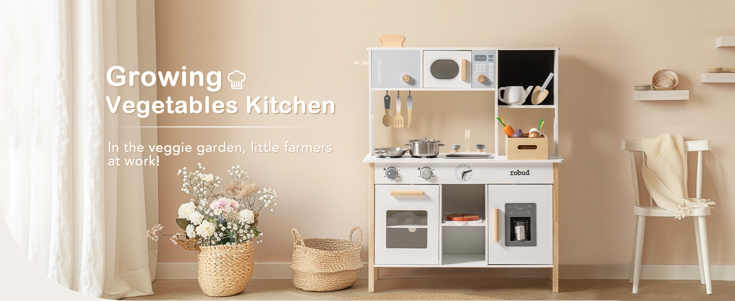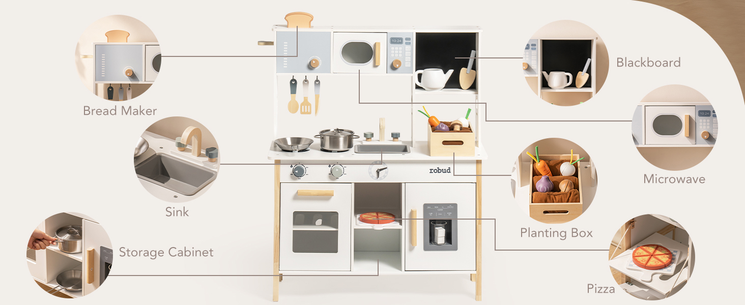 【جودة موثوقة】مصنوع من الخشب الفاخر، وقد تم تصميم مطبخ اللعب ROBUD بأسطح ناعمة وحواف مستديرة لضمان السلامة أثناء اللعب. إن بنيتها القوية وموادها المتينة تجعلها إضافة طويلة الأمد لوقت لعب طفلك.