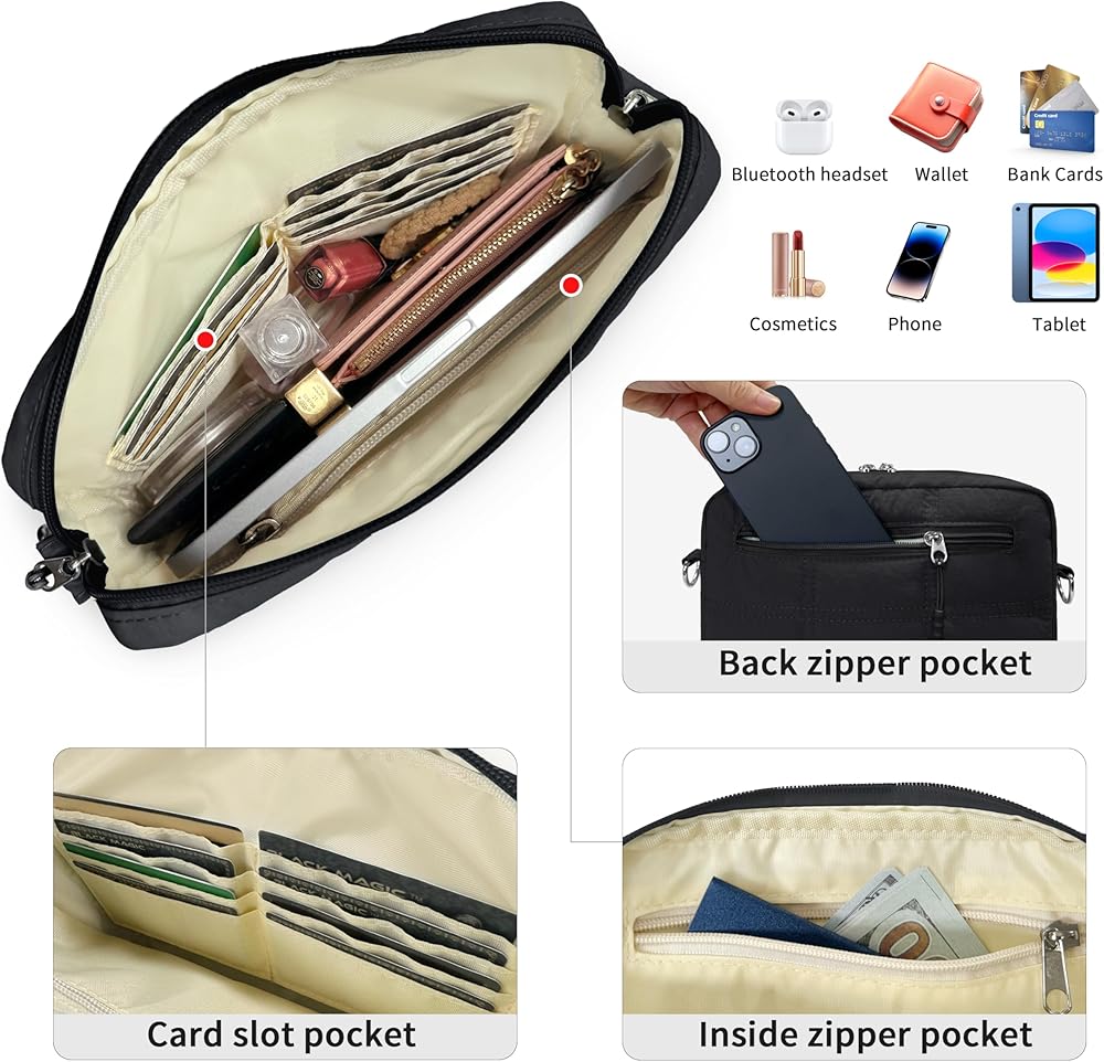• Multifunctional and spacious: Measuring 9.8 (L) x 1.57 (W) x 7.08 (H) inches, one main zippered pocket can hold the items you need for your daily travels, such as wallet, keys, cosmetics, headphones and more. An interior zippered pocket is used to store valuables such as cash.8 card slots are enough for credit cards, ID cards and driver's license. A back zippered pocket keeps your belongings safe and secure.