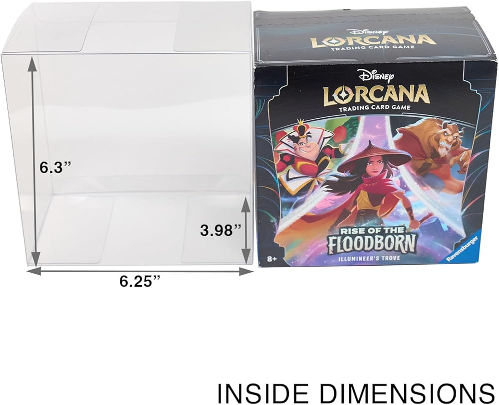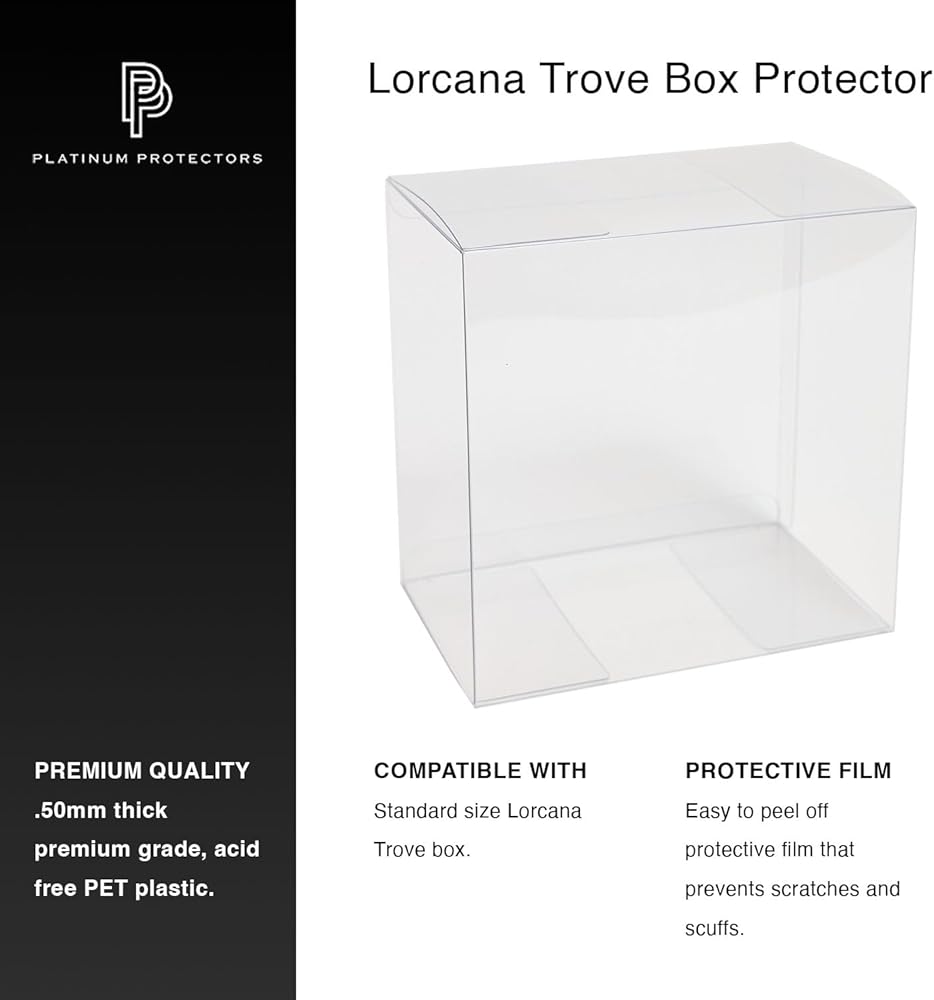 Platinum Protectors plastic protector cases are designed to fit your Lorcana Trove boxes perfectly. You have money invested in your collection, so why not show them off? Display your boxes with our highest quality, acid-free PET plastic material that will shield your boxes from everyday wear and tear. Please check exact dimensions before ordering. INSIDE DIMENSIONS: 6.25" x 3.98" x 6.3" NOTE: Box(s) in photo are for demonstration purposes only and is not included.