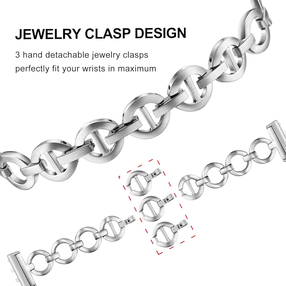 تغيير المقاس بسهولة: يناسب المعصم من 5.5 بوصة إلى 7.7 بوصة (140 مم إلى 195 مم)، ويغطي معظم معاصم النساء. 3 مشابك مجوهرات قابلة للفصل يدويًا، يمكن إزالتها بسهولة لضبط طول السوار، تناسب معصمك تمامًا إلى أقصى حد.