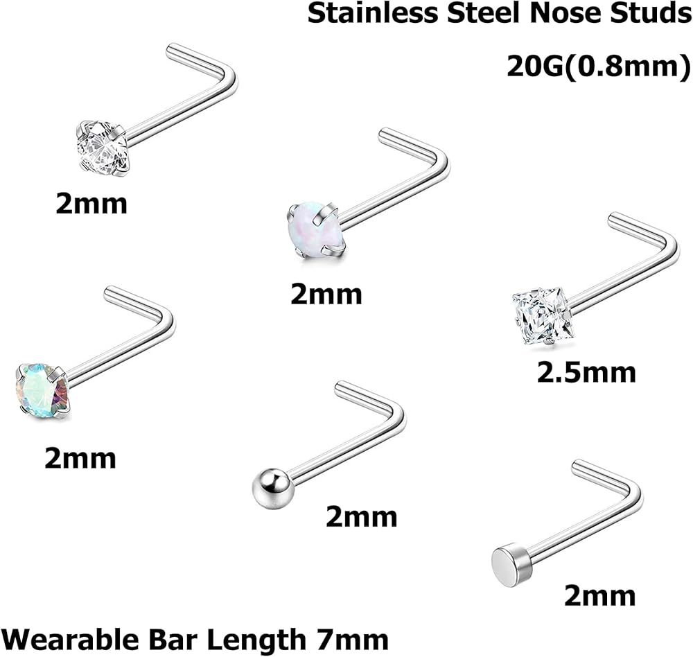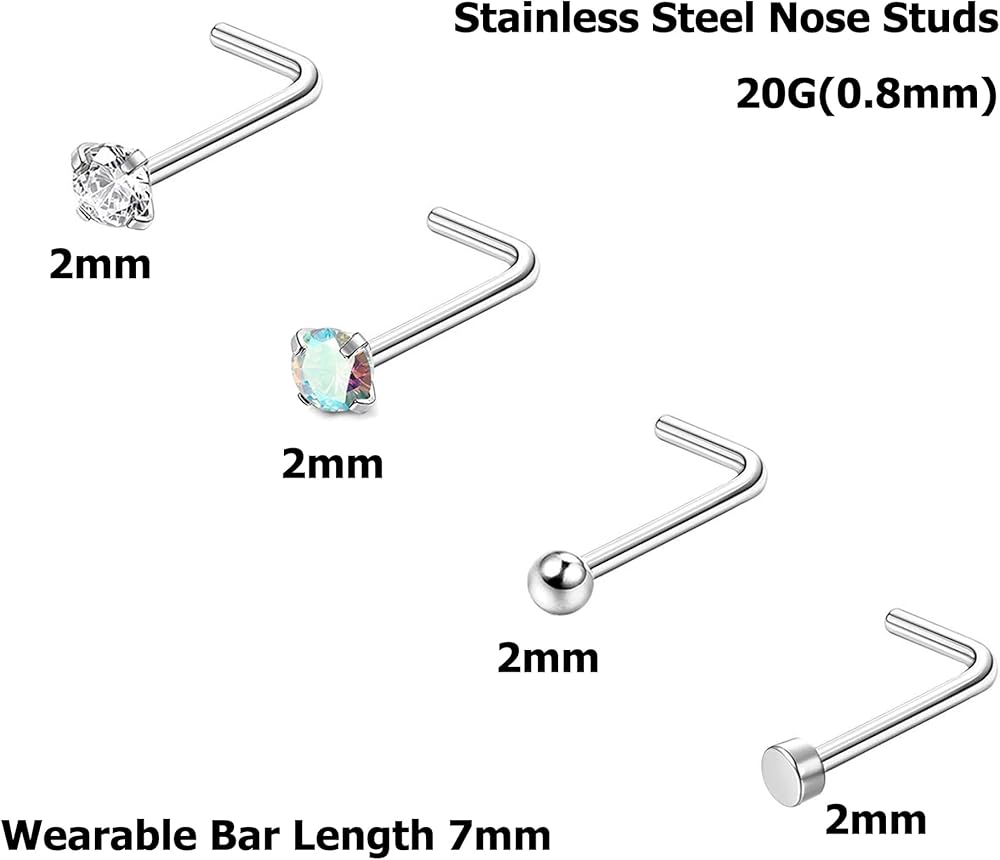 [مقاسات متعددة] مقياس مسامير الأنف: 20 جم (0.8 مم)، طول الشريط: 7 مم، تشيكوسلوفاكيا/الكرة/النقطة/العقيق الحجم: 2 مم. أنماط مختلفة متطابقة بحرية تناسب أي مناسبة. سطح مصقول للغاية وتصميم نهاية كروية مستديرة، مريح في الارتداء.
