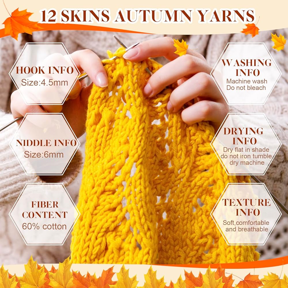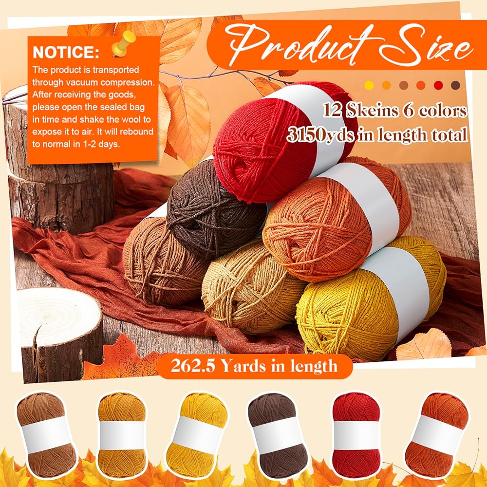 • Versatile for Knitting Projects: whether you're knitting sweaters, scarves, shawls, or hats, the autumn yarn has got you covered, you will receive 12 skeins of yarn in 6 autumn colors, each skeins weighs approx. 100 grams and measures about 240 m/ 262.5 yards long