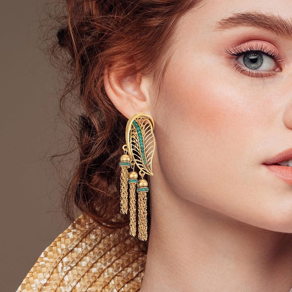 - تحدثي عن هذه الأقراط ذات الشرابة الكلاسيكية التي تتميز بالألماس التشيكي الأخضر المذهل والشرابات الذهبية