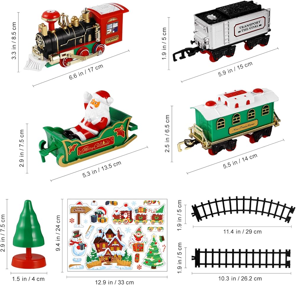 Christmas train set: Locomotive x 1; Carriage x 1; Coal Car x 1; Santa Claus x 1; Straight Track x 2; Turning Track x 8; Christmas Tree x 1; Decorative Sticker x 1. You can connect them easily without spending too much time and energy.