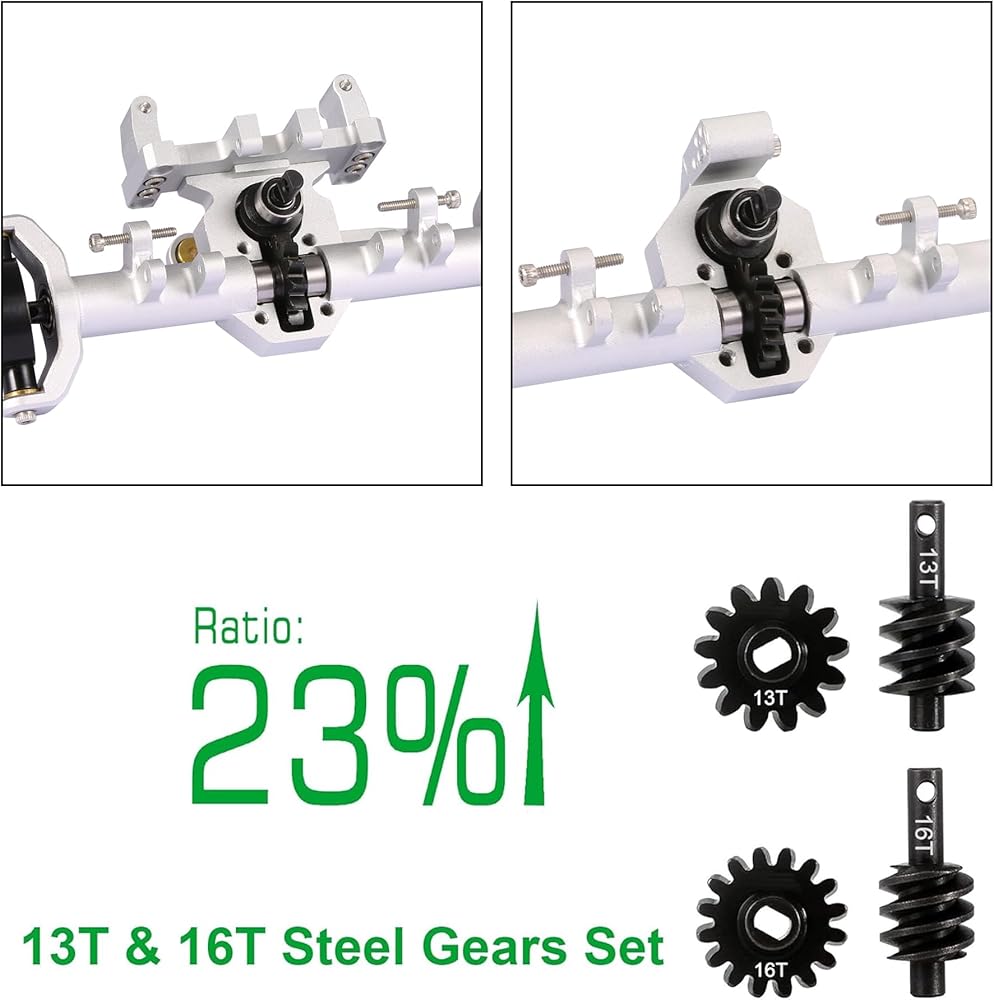 تروس مطورة: تستخدم محاور SCX24 مجموعة تروس دودية 13T (أمامية) و16T (خلفية). تعمل تروس السرعة 13T على زيادة السرعة بنسبة 23% تقريبًا