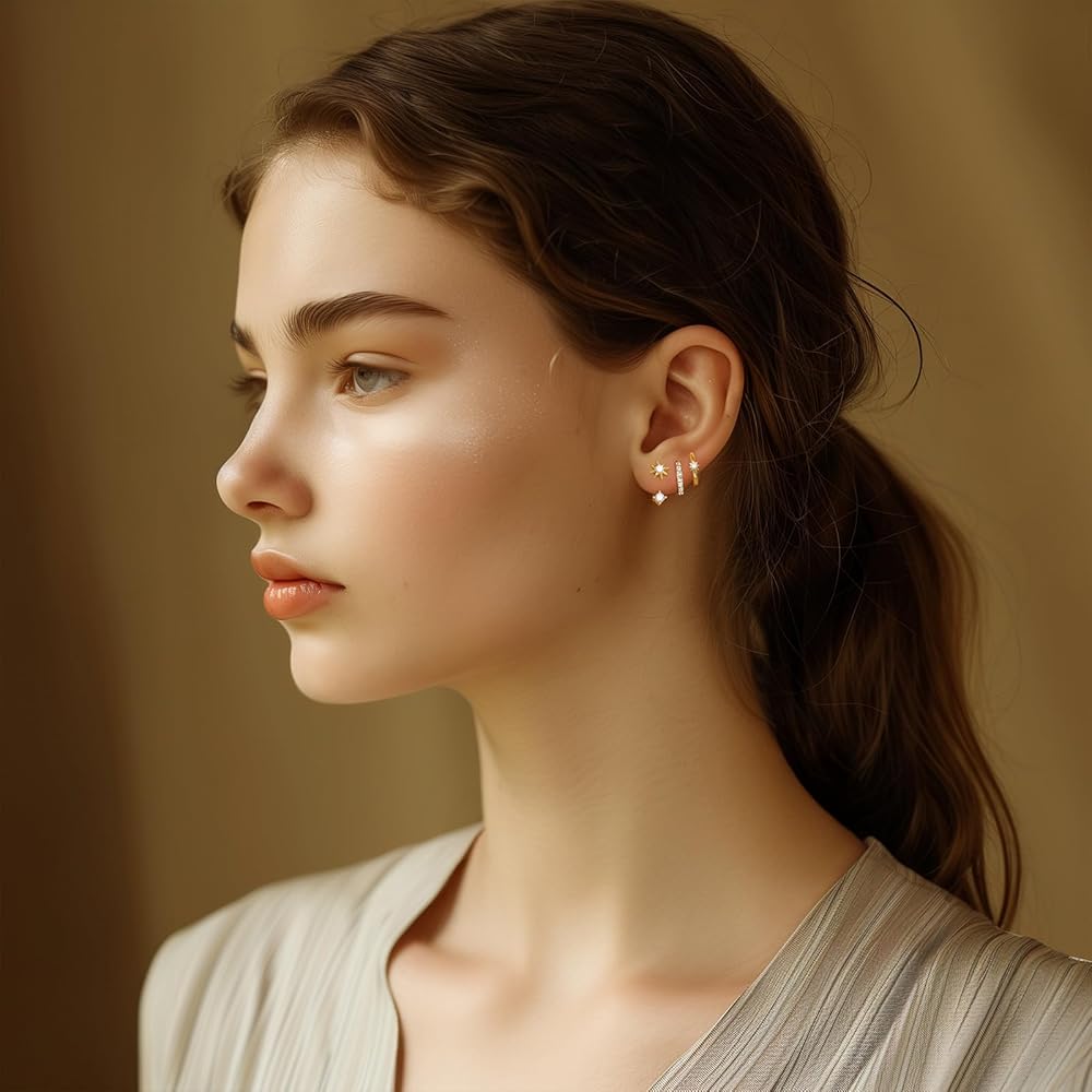 مواد الأقراط الذهبية: الأقراط الحلقية الدقيقة مصنوعة من النحاس المطلي بالذهب عيار 14 قيراط، وأعمدة أذن من الفضة الإسترلينية عيار 925 وزركونيا مكعب 5A. جميع أقراطنا النسائية العصرية خالية من الرصاص والنيكل ولا تسبب الحساسية. كلا براقة ومطمئنة للنساء