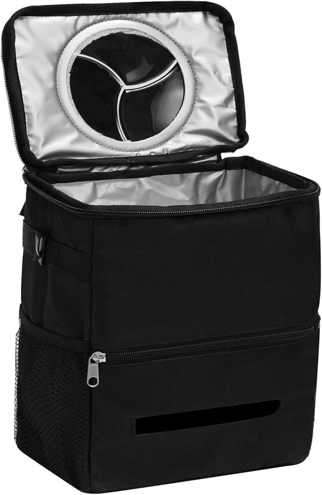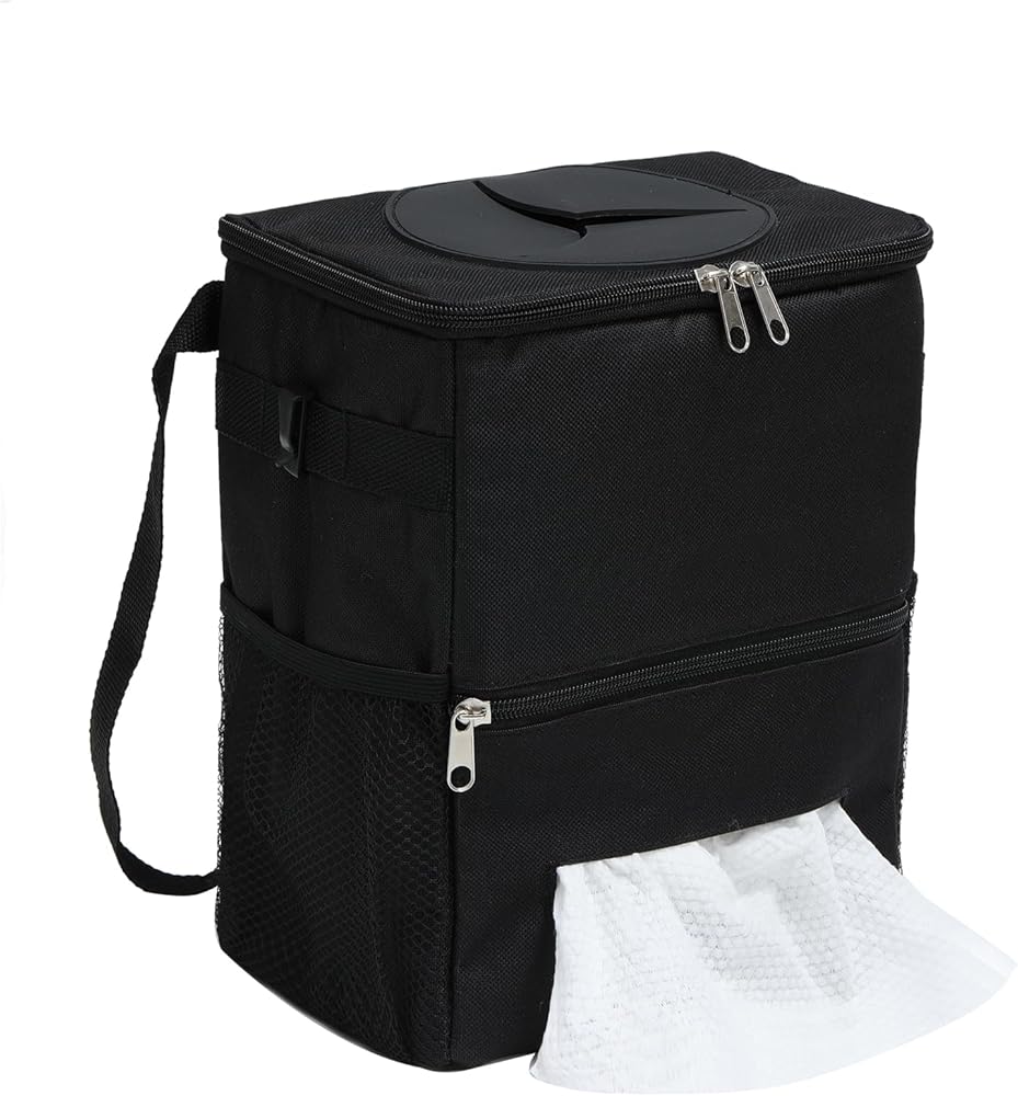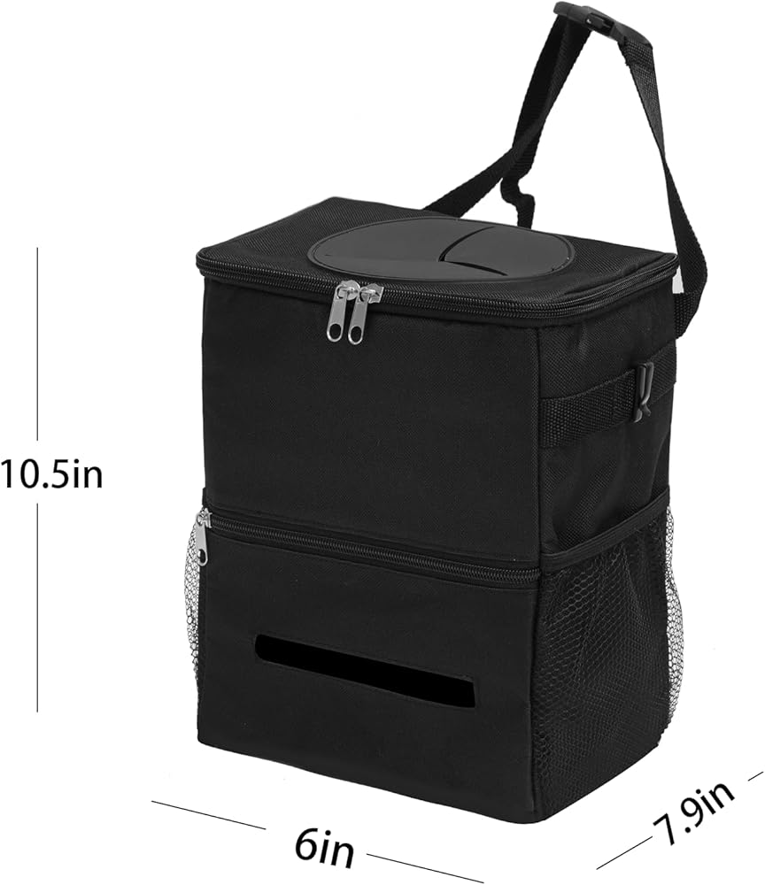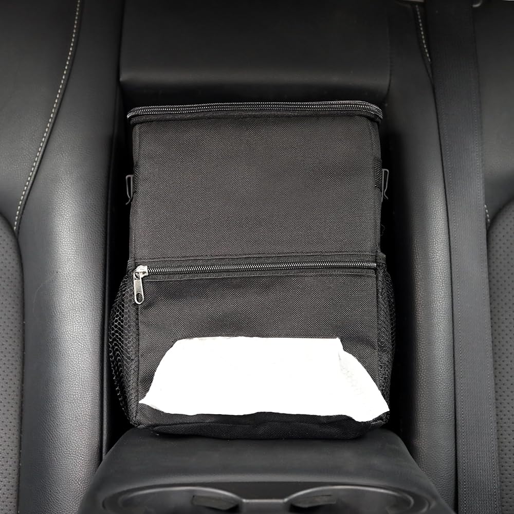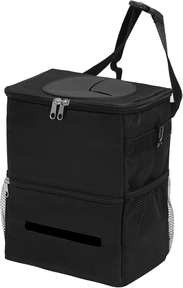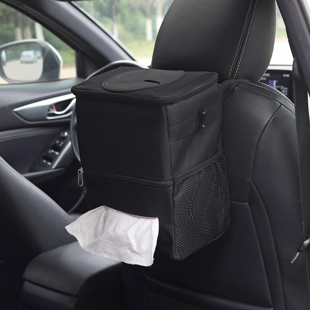 سلة قمامة السيارة مع غطاء سلة مهملات السيارة مع حقيبة مناديل معلقة حقيبة قمامة السيارة لسيارات الدفع الرباعي باللون الأسود