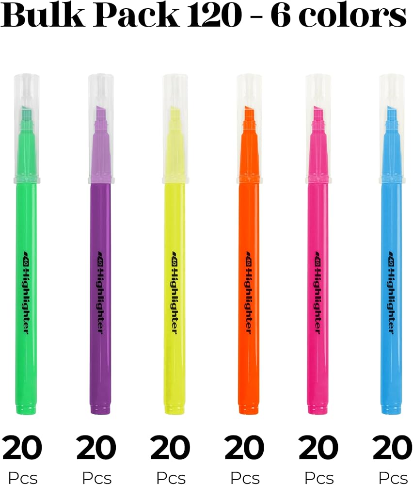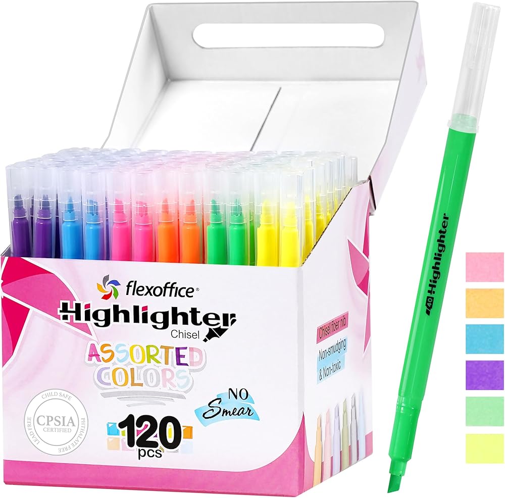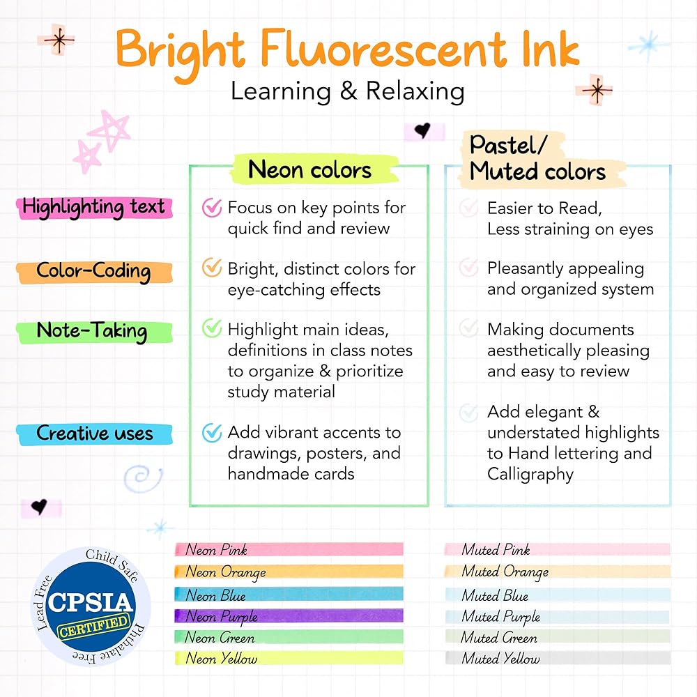 معتمدة للسلامة: تلبي هذه الولاعات العالية للمدرسة معايير ASTM F963-23 وCPSIA. سواء كنت تبحث عن مجموعة متنوعة من هايلايتر الباستيل أو هايلايتر النيون، فإن مجموعتنا من هايلايتر الألوان المتنوعة ستلبي احتياجاتك.