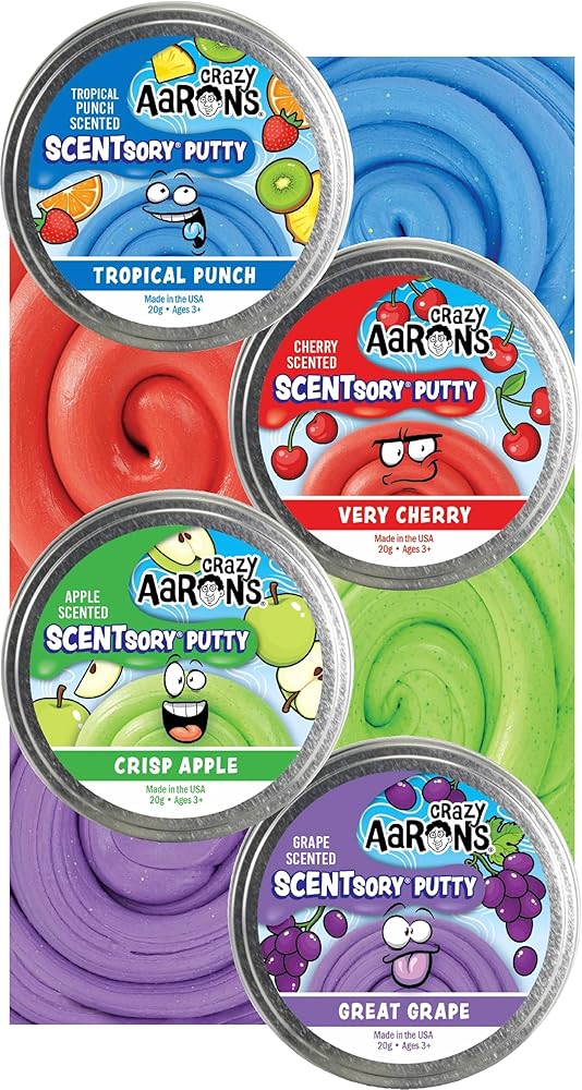 • This is an amazing set of 4 (2.75 Inch, 20g) SCENTsory Tins from Crazy Aaron! Crazy Aaron's SCENTsory putty goes way beyond scent to invoke a total sensory experience like no other. Indulge your senses with the velvety soft touch, the dynamic look, and the wonderful scent and discover just how amazing SCENTsory putty can make you feel. This set makes a great gift and is ideal for party favors, special needs, stocking stuffers, schools and so much more!