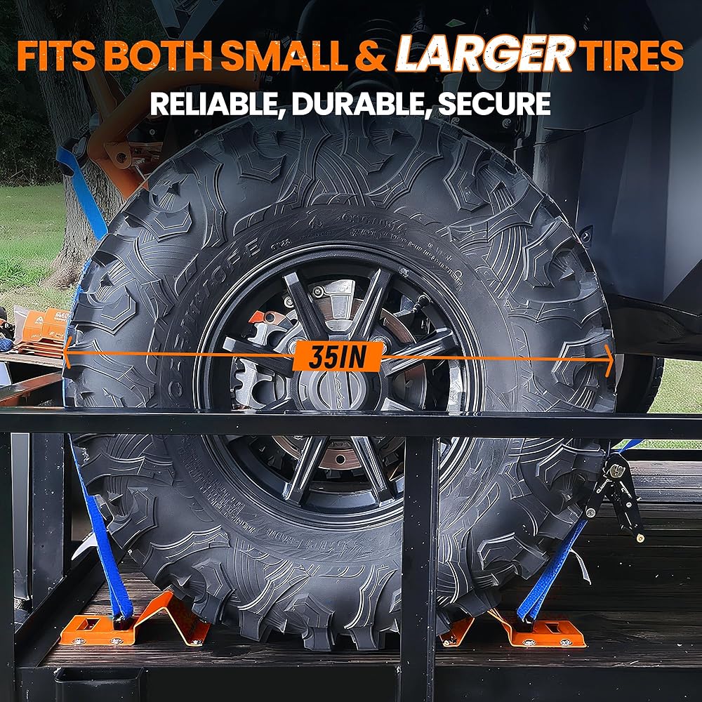 سهولة التركيب: ما عليك سوى ركوب مركبة ATV الخاصة بك لأعلى وفوق الأوتاد المثبتة على الأرض حتى يصبح الإطار محكمًا بين الأوتاد. ثم قم بلف حزام E-Track حول الإطار وقم بتثبيته بشكل آمن في فتحة E-Track الموجودة على مسند العجلة