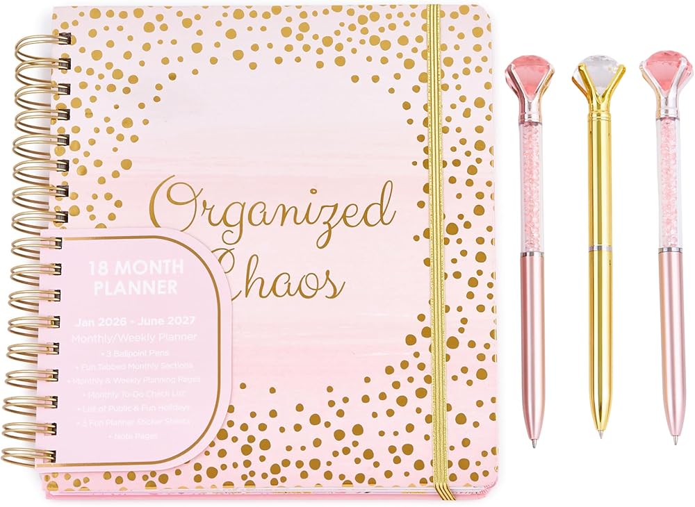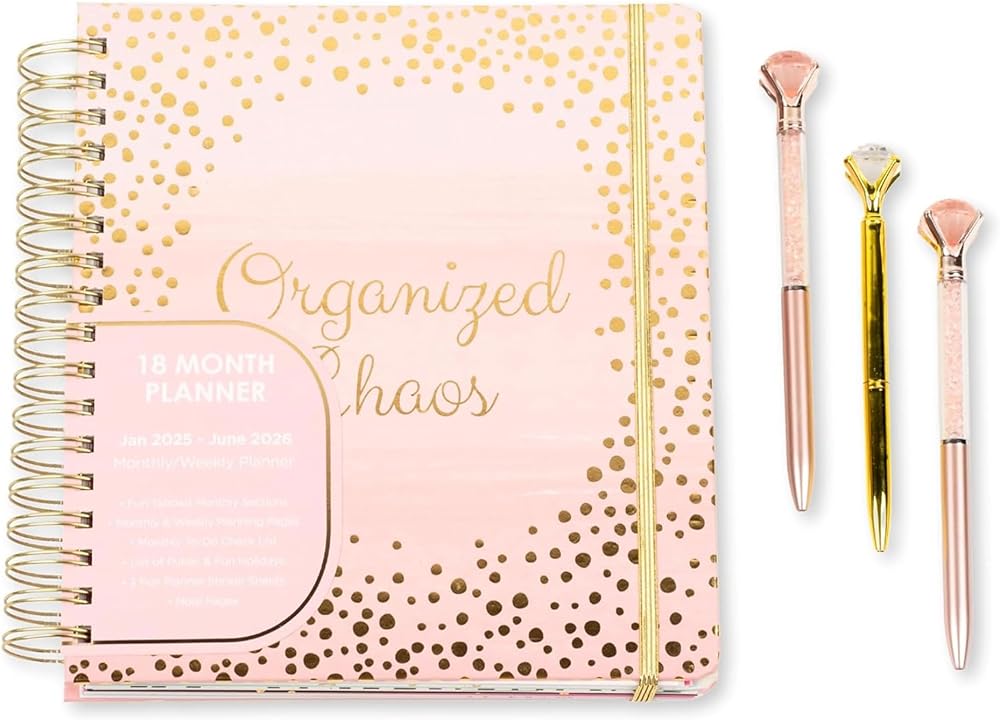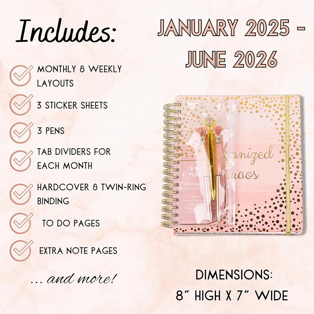 • ابقِ منظمًا دائمًا: يشتمل هذا المخطط اللطيف 2024-2026 على أقسام شهرية مبوبة، وأقسام تخطيط شهرية وأسبوعية ويومي، وقوائم مرجعية للمهام، وصفحات ملاحظات مبطنة مع مساحة للأهداف والأفكار حتى تظل منظمًا دائمًا!  سيساعدك هذا المخطط الصغير 2024-2026 على ضمان عدم تفويت أي تاريخ أو موعد نهائي مهم.
