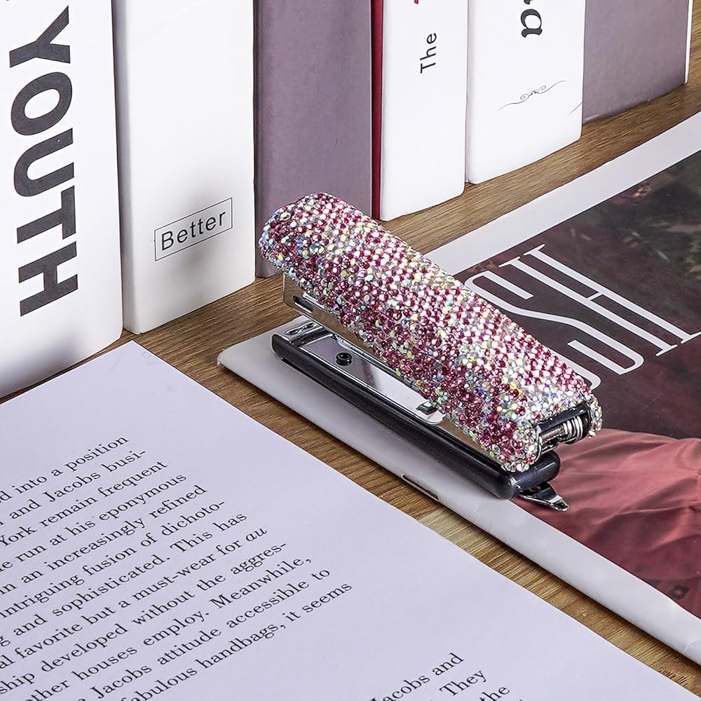 - Is ideal for decorating office, home, hotel, or anywhere you need . - The Rhinestone Crystal Stapler features a stunning rhinestone exterior with a sleek black base, adding a touch of elegance and luxury to any workspace. - It can hold up to 2-12 sheets at once, you can also easily open it to replace the staples anytime you are running low. - This mini stapler only works with smaller sized staples, which is size No. 10 (3/8 of an inch).