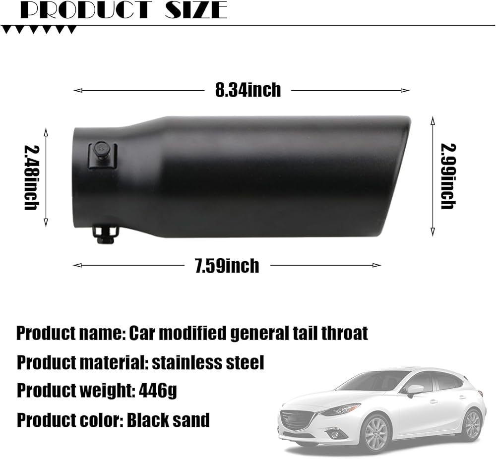 Product Parameters: The total length of the exhaust pipe is 8.34In. The height of the exhaust pipe is 2.99In. The exhaust pipe fastening port height is 2.48In. The bottom length of the exhaust pipe is 7.59In. The inner diameter length of the exhaust pipe is 2.55In. After purchase, you will receive 1 x exhaust pipe, which is enough for vehicle modification.