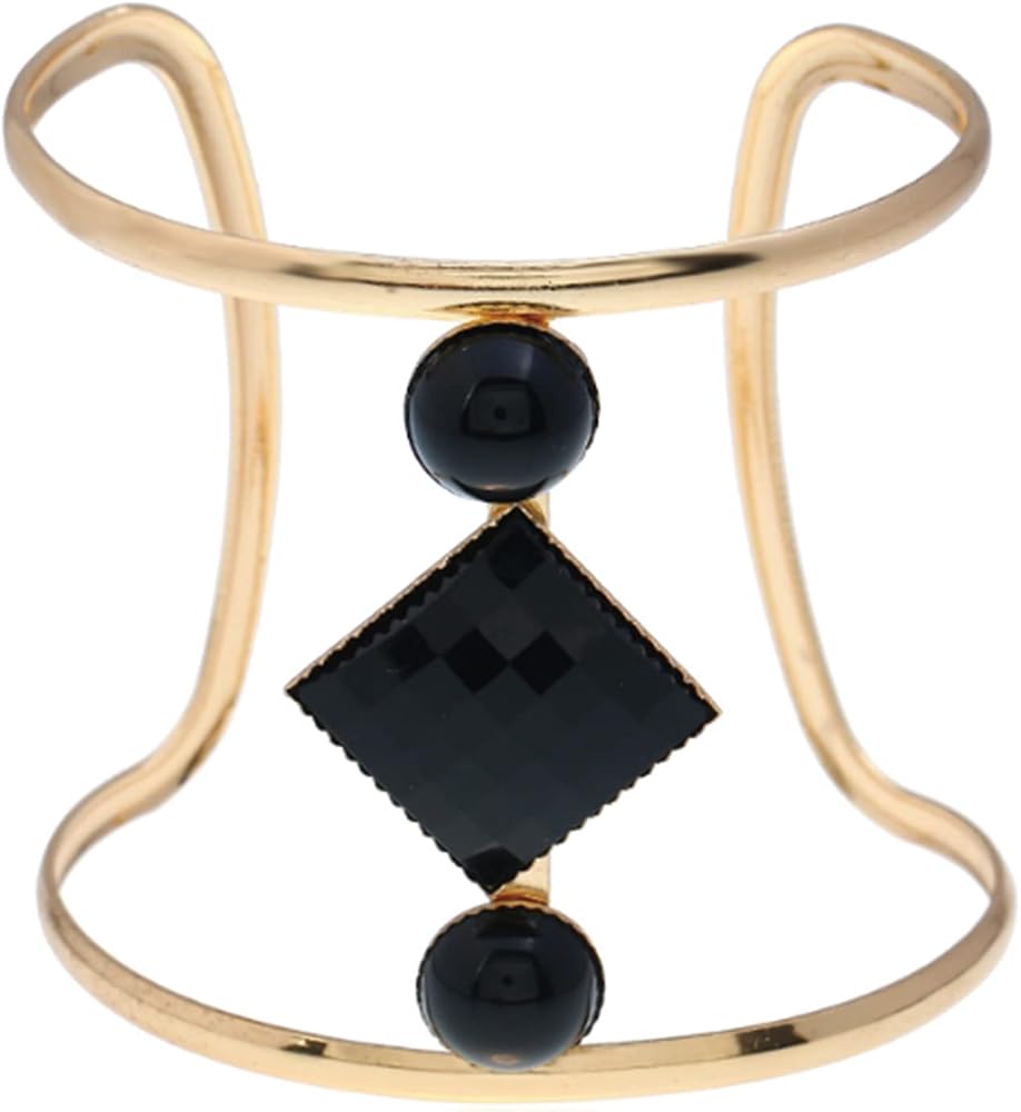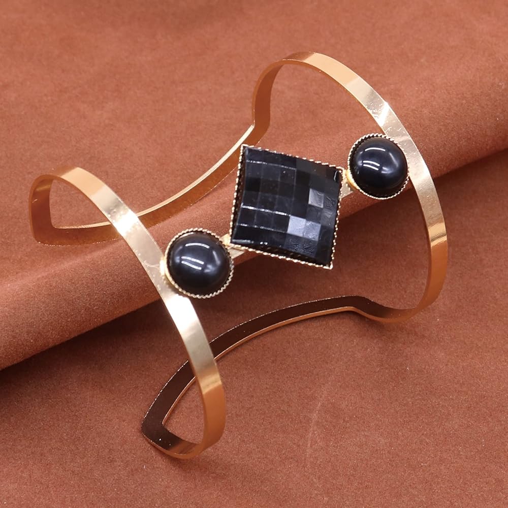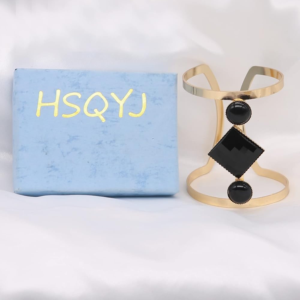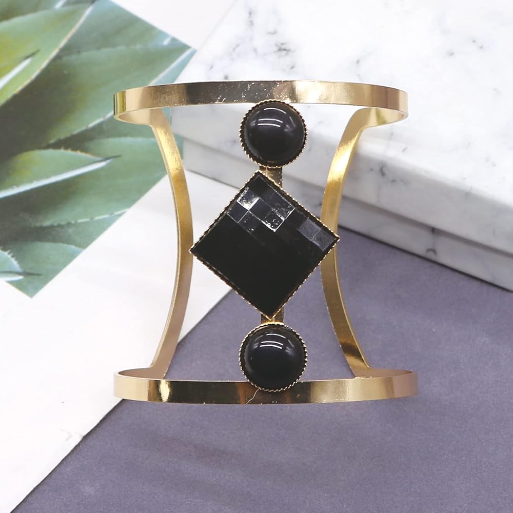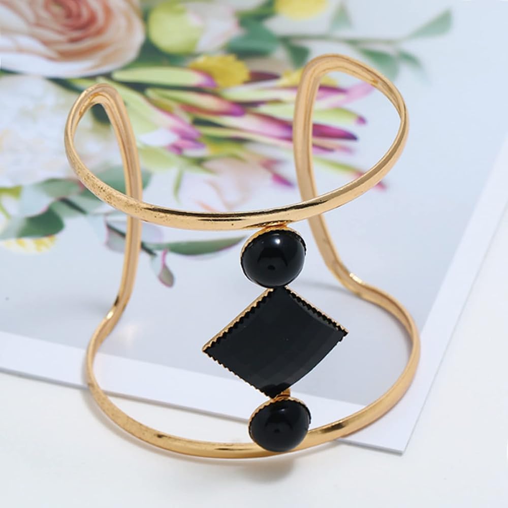 • Unique hollow geometry resin stone wide cuff design opening bangles, safety and comfortable, gold plated flashing beautiful bangles, great quality and well made with details, novelty elegant bracelet jewelry accessories.Three kinds of style:black,white and brown.