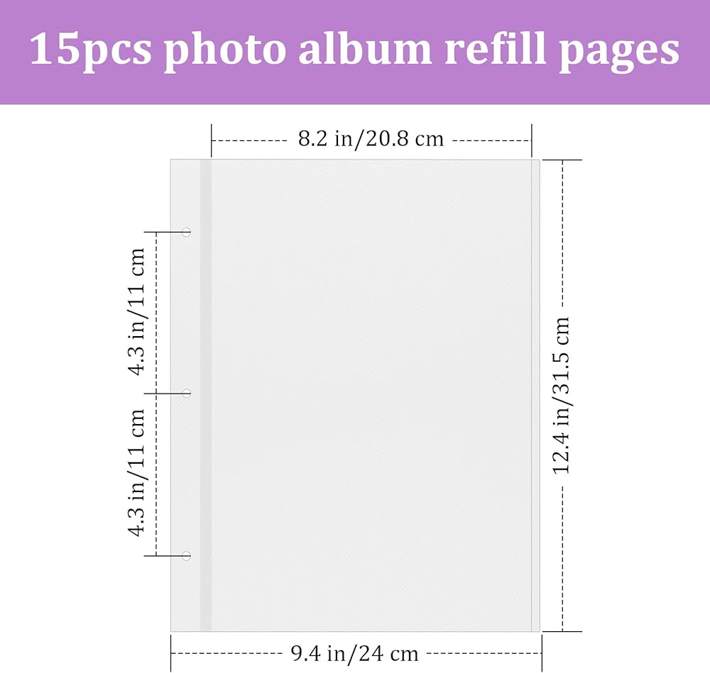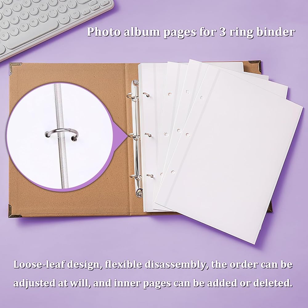 متوافقة مع المجلدات القياسية المكونة من ثلاث حلقات: تحتوي كل عبوة على 15 ورقة (30 صفحة) من صفحات الألبوم بحجم 9 × 11 بوصة، مع ثلاث فتحات مثقوبة مسبقًا. إنها تناسب المجلدات القياسية ثلاثية الحلقات أو المجلدات على شكل D، مما يضمن تنظيمًا سهلاً ومريحًا