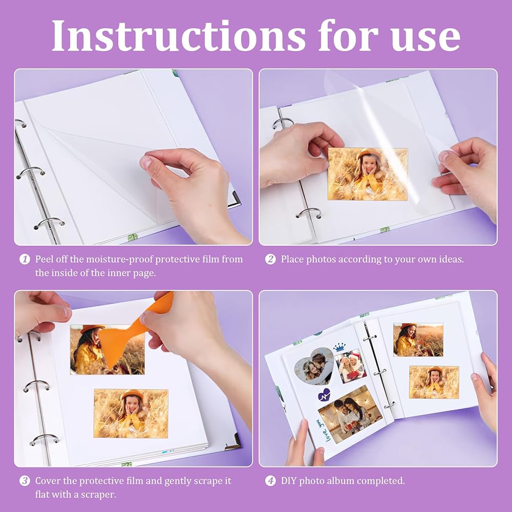 مقاومة للماء والأحماض وخالية من كلوريد الفينيل: تتميز هذه الصفحات بتصميم ذاتي اللصق، ولن تلحق الضرر بالعناصر المخزنة أو تسبب بهتان اللون. يمكن إعادة استخدامها وإعادة وضعها حسب الحاجة. يقاوم الفيلم الاصفرار والأكسدة، ويوفر حماية طويلة الأمد للصور والتذكارات الأخرى