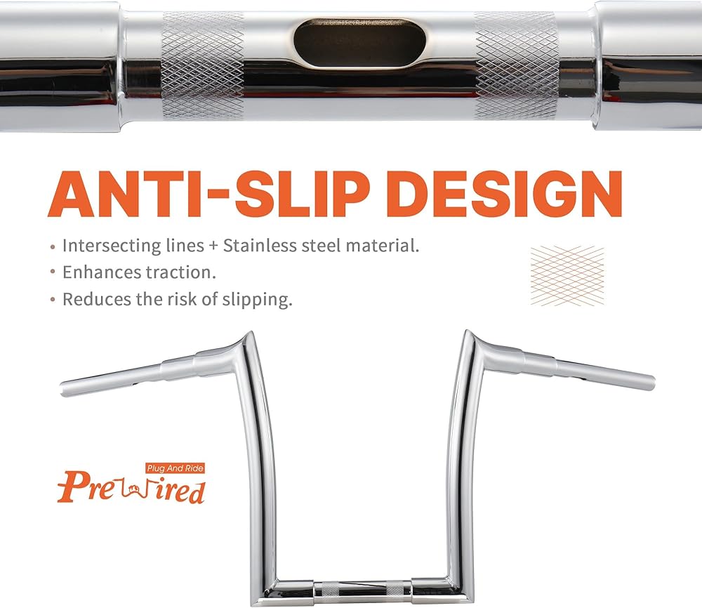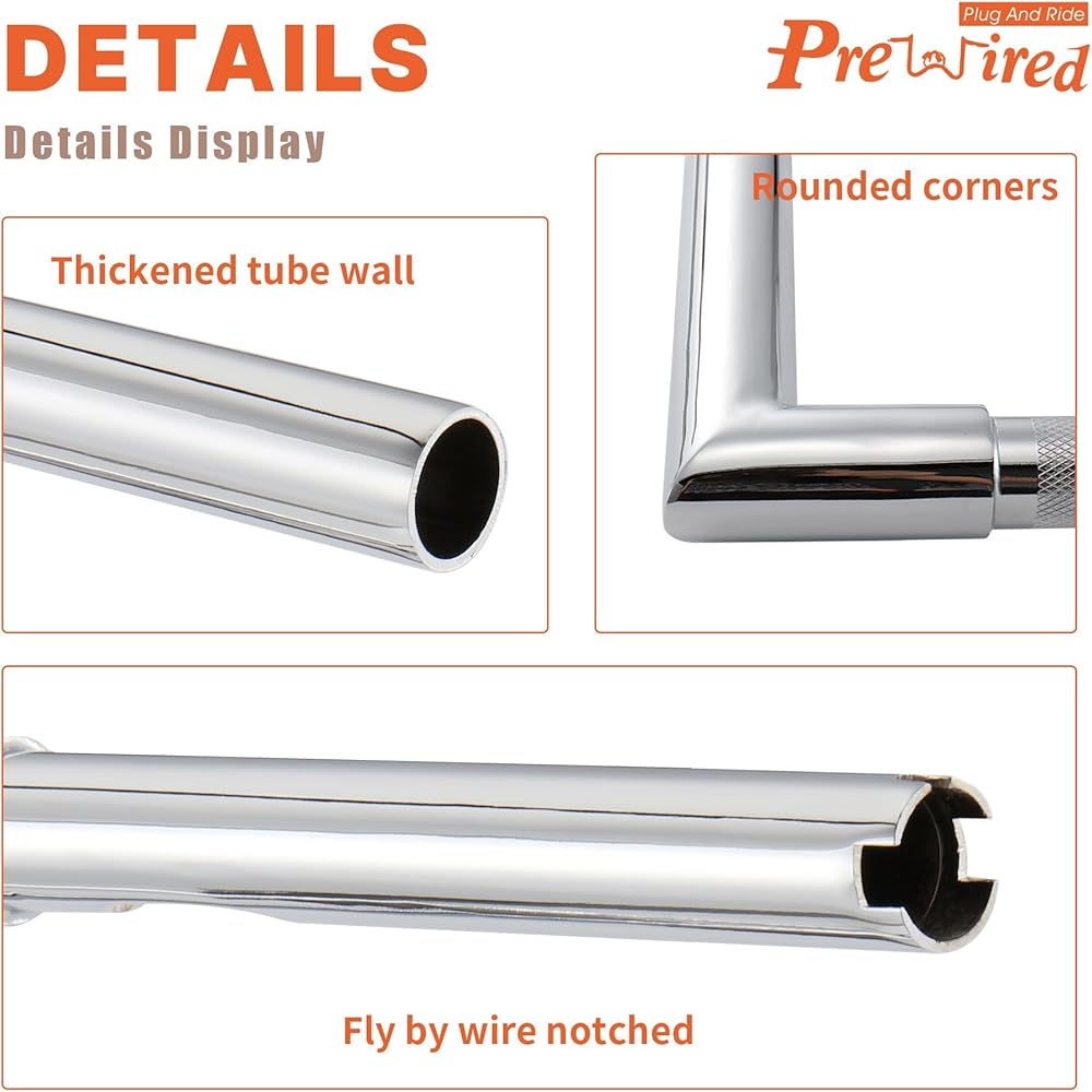 المظهر الأنيق: تعد المقاود إحدى أفضل الطرق للإدلاء ببيان وتغيير مظهر دراجتك بشكل جذري. يتميز المقود الخاص بنا بفتحات معدنية مخصصة لتركيب الأسلاك، مما لا يجعل الدراجة النارية تبدو أكثر جمالاً بشكل عام فحسب، بل يوفر أيضًا الحماية للأسلاك ذات الفتحات الغائرة الناعمة.