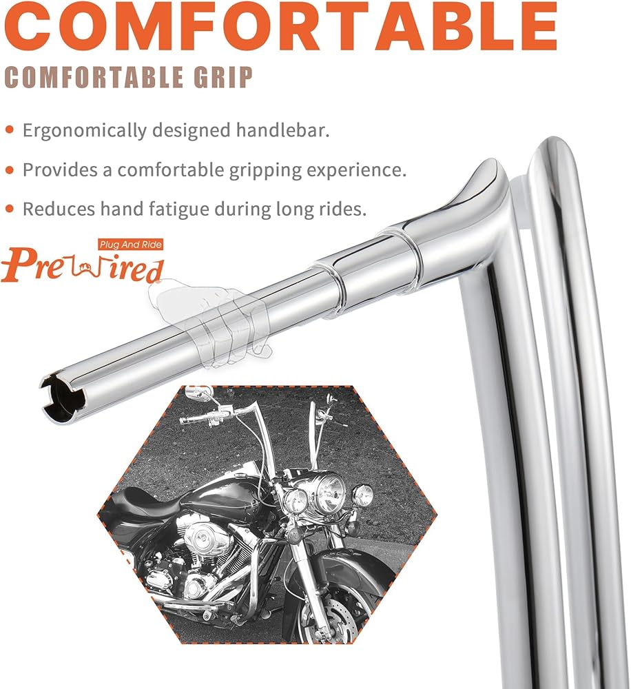 أداء قوي في التعامل: يوفر المقود ذو القطر السميك 1.5 بوصة للراكبين حجم قبضة أكثر راحة، مما يعزز راحة المناورة بالدراجة النارية. يساهم Fat Monkey Bagger في تحسين السيطرة والتوجيه، مما يحسن راحة الركوب والسلامة.