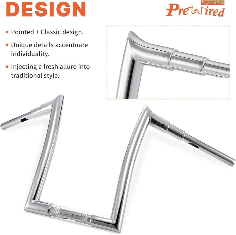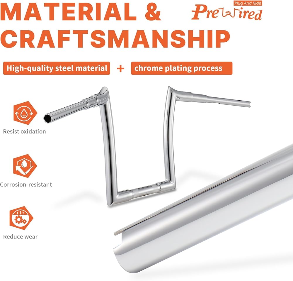 مقود الدراجة النارية من الفولاذ المقاوم للصدأ: مقود الدراجة النارية Monkey Bagger مصنوع من الفولاذ المقاوم للصدأ عالي الجودة. يتميز الإصدار الأسود بطلاء مسحوق أسود لامع، بينما يستخدم إصدار الكروم عملية طلاء كهربائي عالية المستوى. لا يوجد خبث داخل المقود، مما يجعل تركيب القضيب سهلاً للغاية.