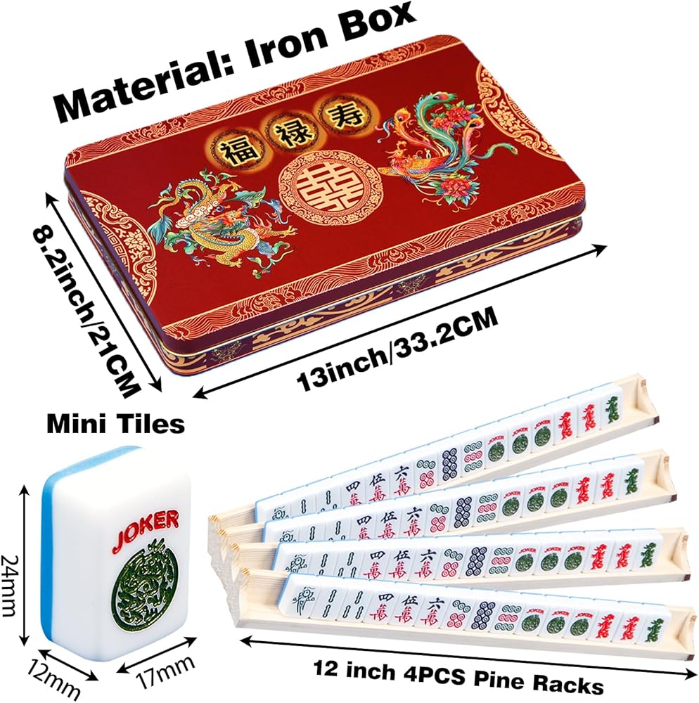 مجموعة ماجونج صغيرة كاملة: تتضمن مجموعات ماجونج بالحجم الكامل 36 دائرة، و36 خيزران، و36 شخصية، و12 تنينًا، و24 رياحًا، و16 زهرة، و10 جوكر، و4 قطع غيار فارغة، مقاس كل بلاط: 0.95 × 0.66 × 0.47 بوصة (24 × 17 × 12 مم)، 1 صندوق حديد -4 رفوف ماجونغ -2 تعليمات باللغة الإنجليزية -3 نرد