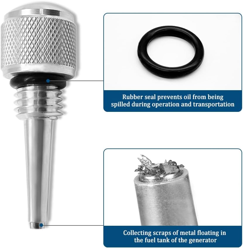 • [Protect your generator] : The aluminum magnetic oil dipstick with rubber ring can capture the natural formation of the fuel tank or accidentally fell into the sediment, and suck out the floating useless metal debris, removing these impurities can extend the service life of the generator. the magnetic stick fit most inverter generator between 1000 and 4000 watts.