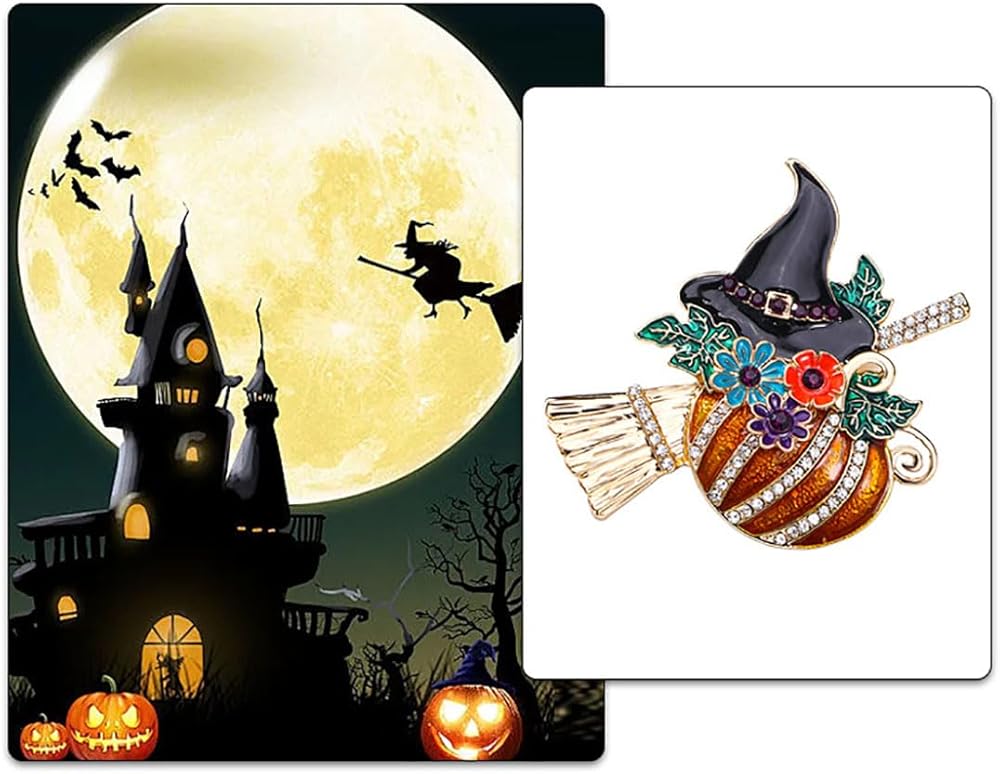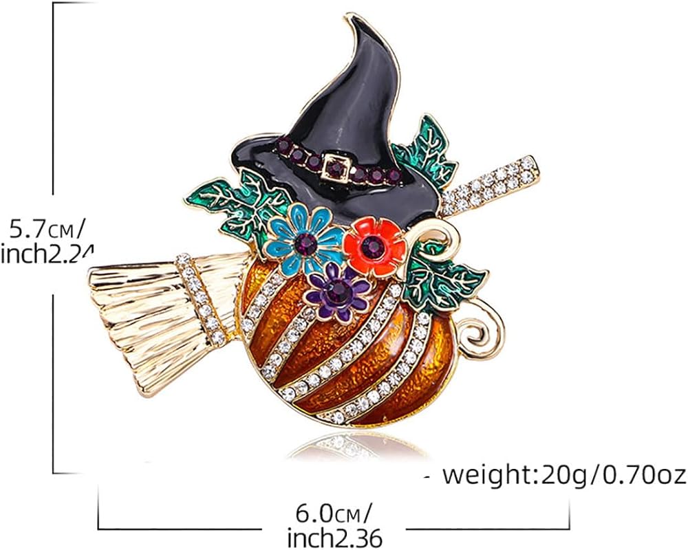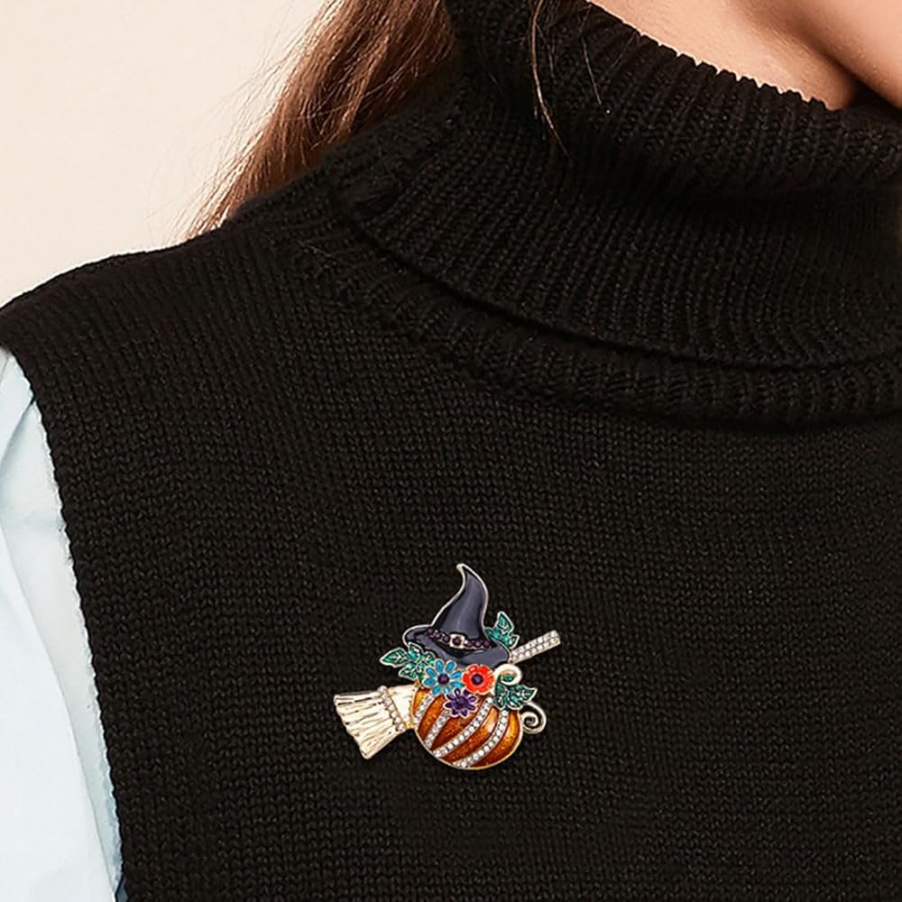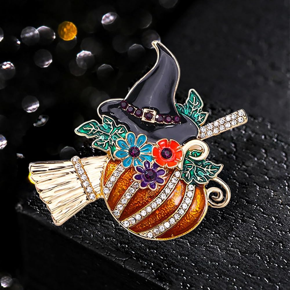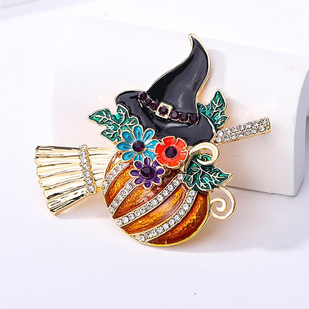 حجر الراين اليقطين قبعة الساحرة بروش دبوس للنساء الرجال المينا كريستال زهرة ورقة مكنسة الهالوين دبابيس فستان أنيق اكسسوارات عطلة مهرجان المجوهرات هدية