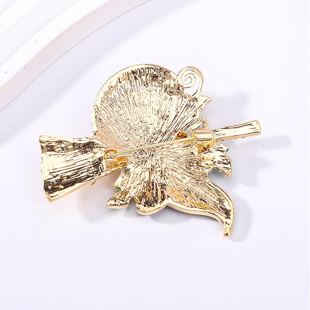 • Whimsical Design: This brooch features a charming owl design with a witch's hat, broomstick, and vibrant enamel flowers in orange, purple, and blue.