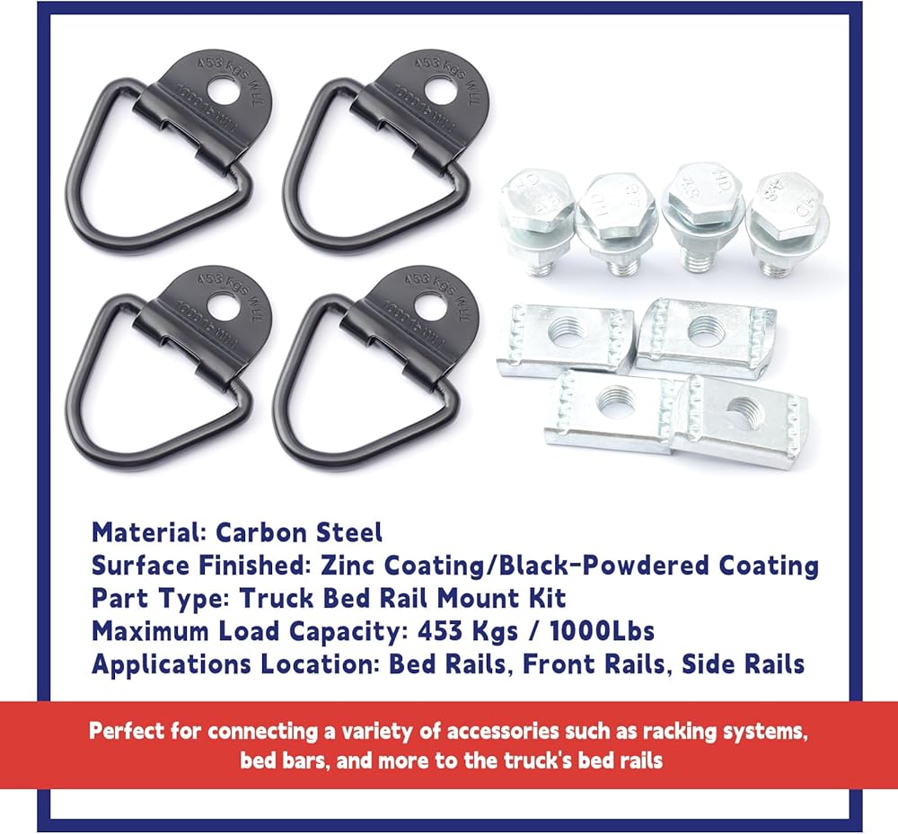 تركيب آمن: تم تصميم مجموعات التثبيت هذه للتثبيت القوي والآمن، وتوفر حلاً يمكن الاعتماد عليه لربط أنظمة الأرفف وقضبان السرير والملحقات الأخرى بقضبان سرير شاحنتك، مما يوفر راحة البال عند حمل الأحمال الثقيلة