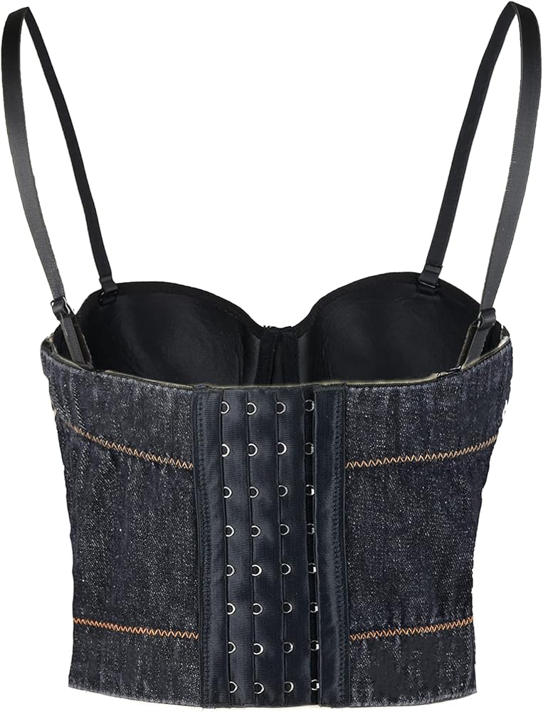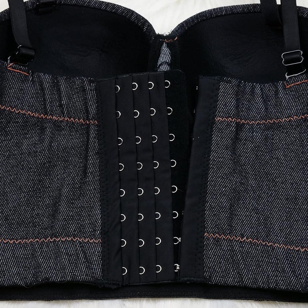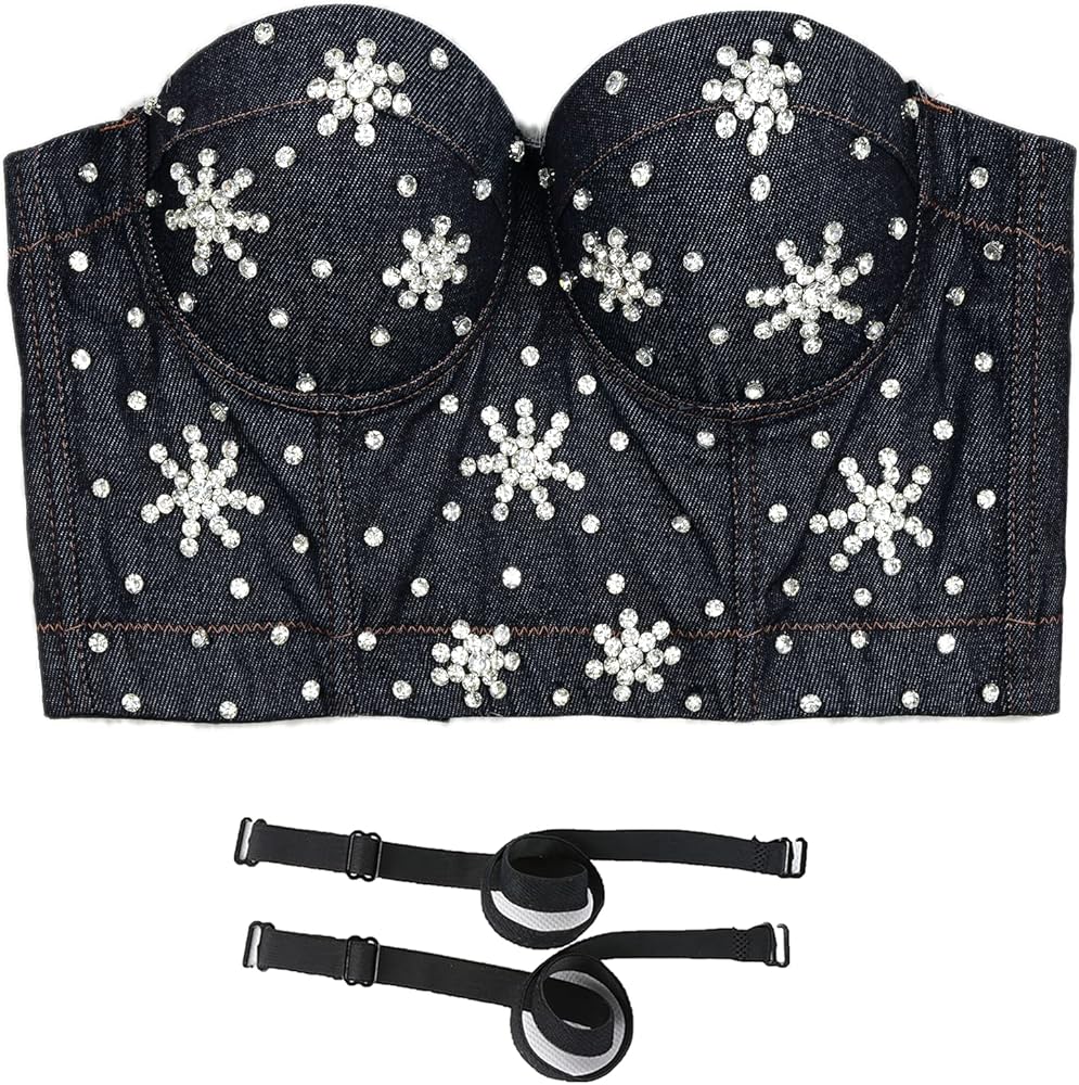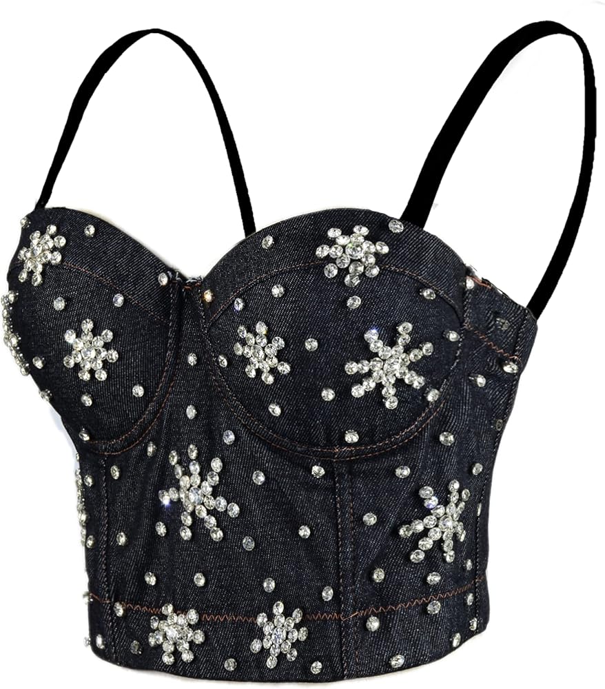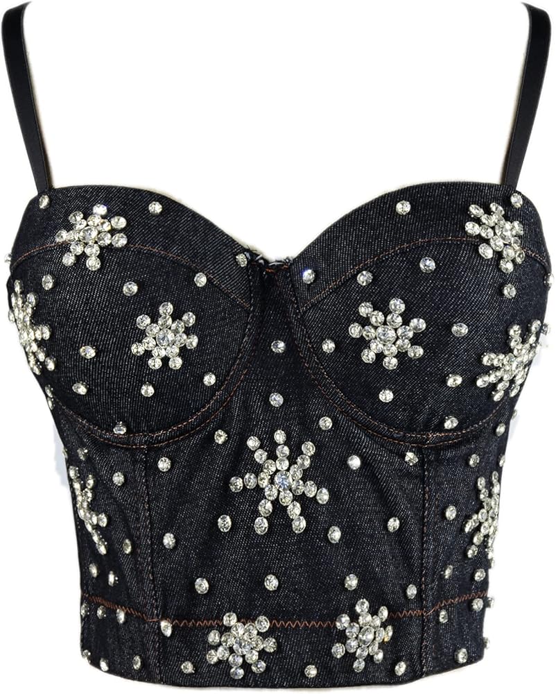 ELLACCI المرأة حجر الراين الزهور الدنيم بوستير المحاصيل الأعلى نادي حزب مشد أعلى أسود متوسط