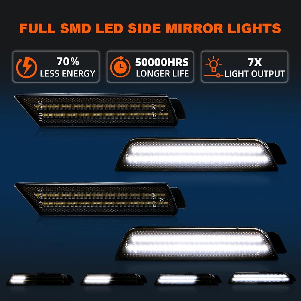【سطوع 7X وعدسة مدخنة أنيقة】تزيد خرزات LED عالية الجودة في الأمام والخلف من الإضاءة بعامل 7. يضيف تصميم العدسات المدخنة الكلاسيكية مظهرًا جديدًا وأنيقًا لسيارتك، بينما يتميز أيضًا بعمر خدمة أطول. من أجزاء OEM