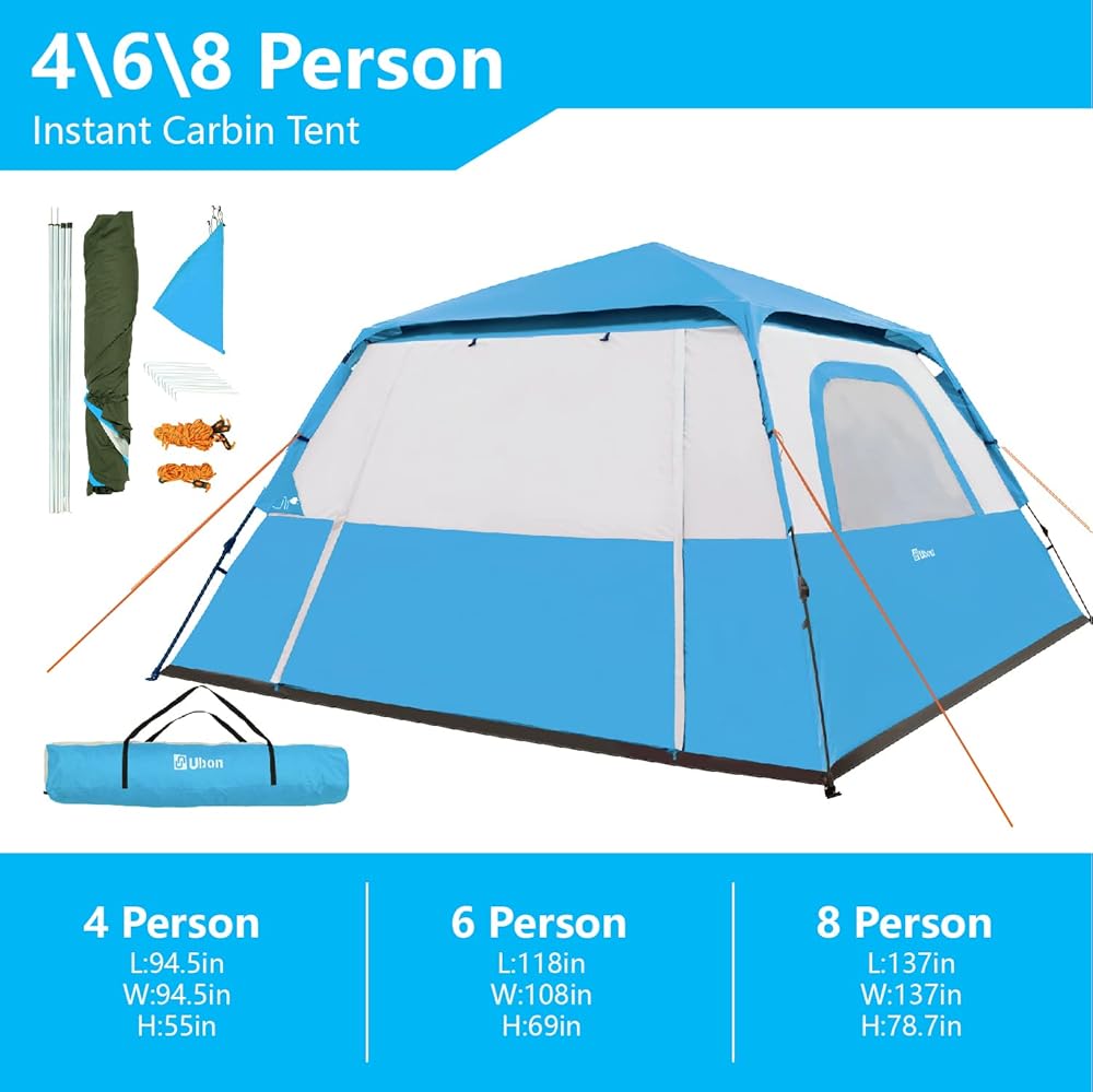 Ubon 4/6/8 شخص 60 ثانية إعداد خيمة التخييم خيمة فورية مقاومة للماء مع ذبابة المطر القابلة للإزالة، خيمة فورية محمولة عائلية خيمة أوتوماتيكية للتخييم والمشي لمسافات طويلة وتسلق الجبال