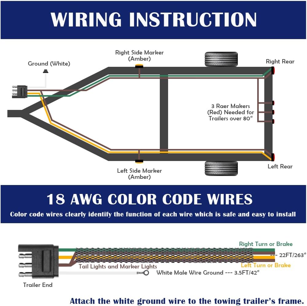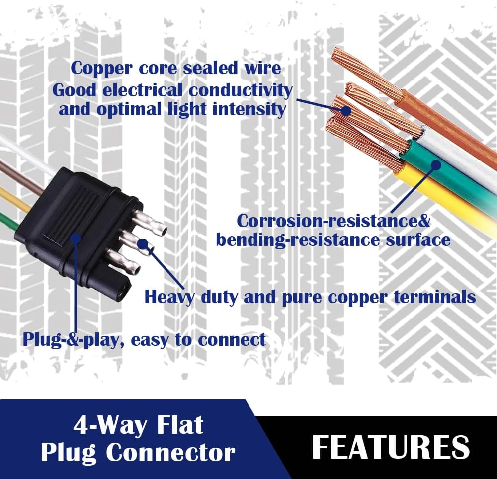 😊مواصفات المنتج: يبلغ طول مجموعة سرج أسلاك المقطورة 22 قدمًا، 18AWG ومجهزة بموصلات قابس مسطحة بأربعة اتجاهات، ويبلغ طول السلك الأرضي الأبيض حوالي 2.5 قدم مع طرف مقاوم للتآكل، والأسلاك محكمة الغلق تمامًا، والتي يمكن أن تقاوم التآكل. للاستخدام على المدى الطويل