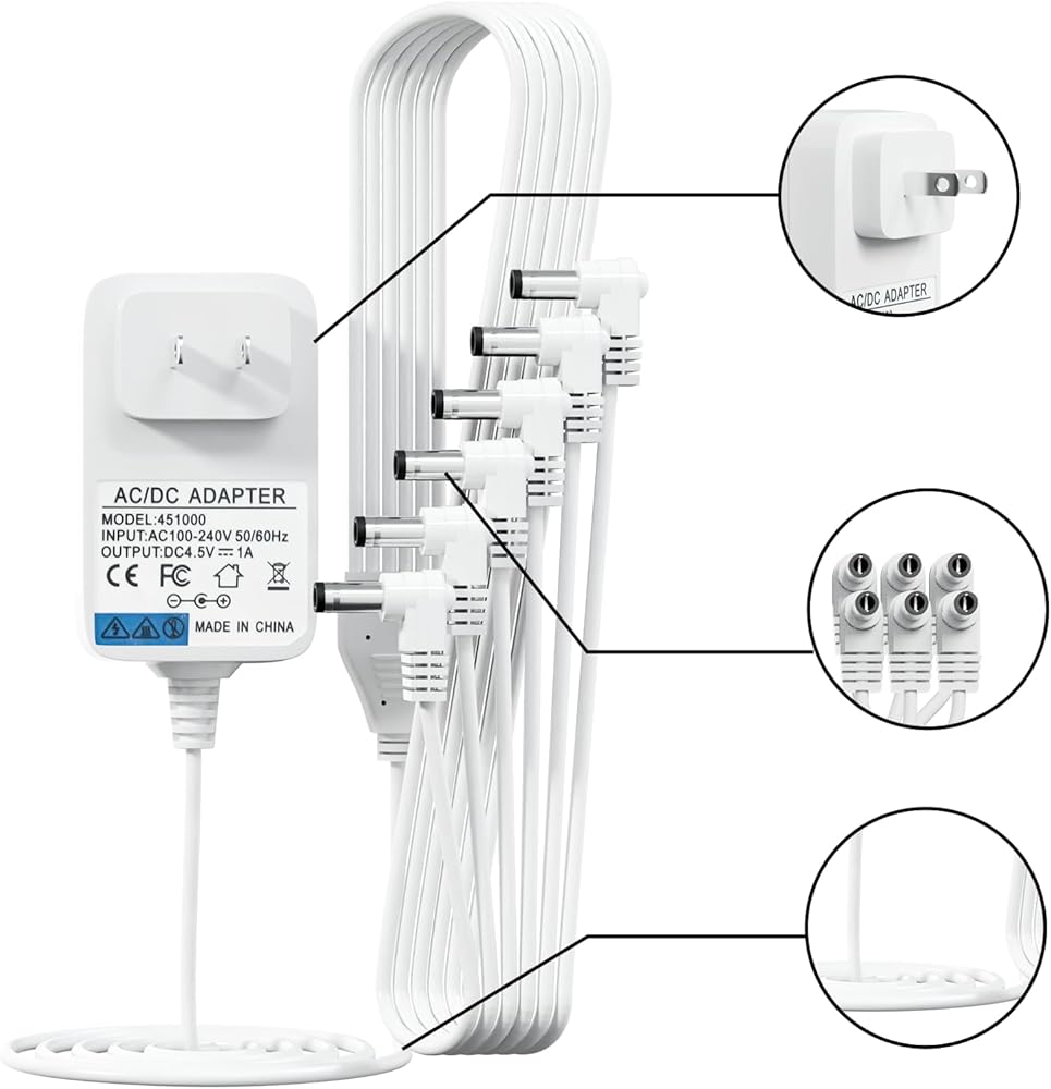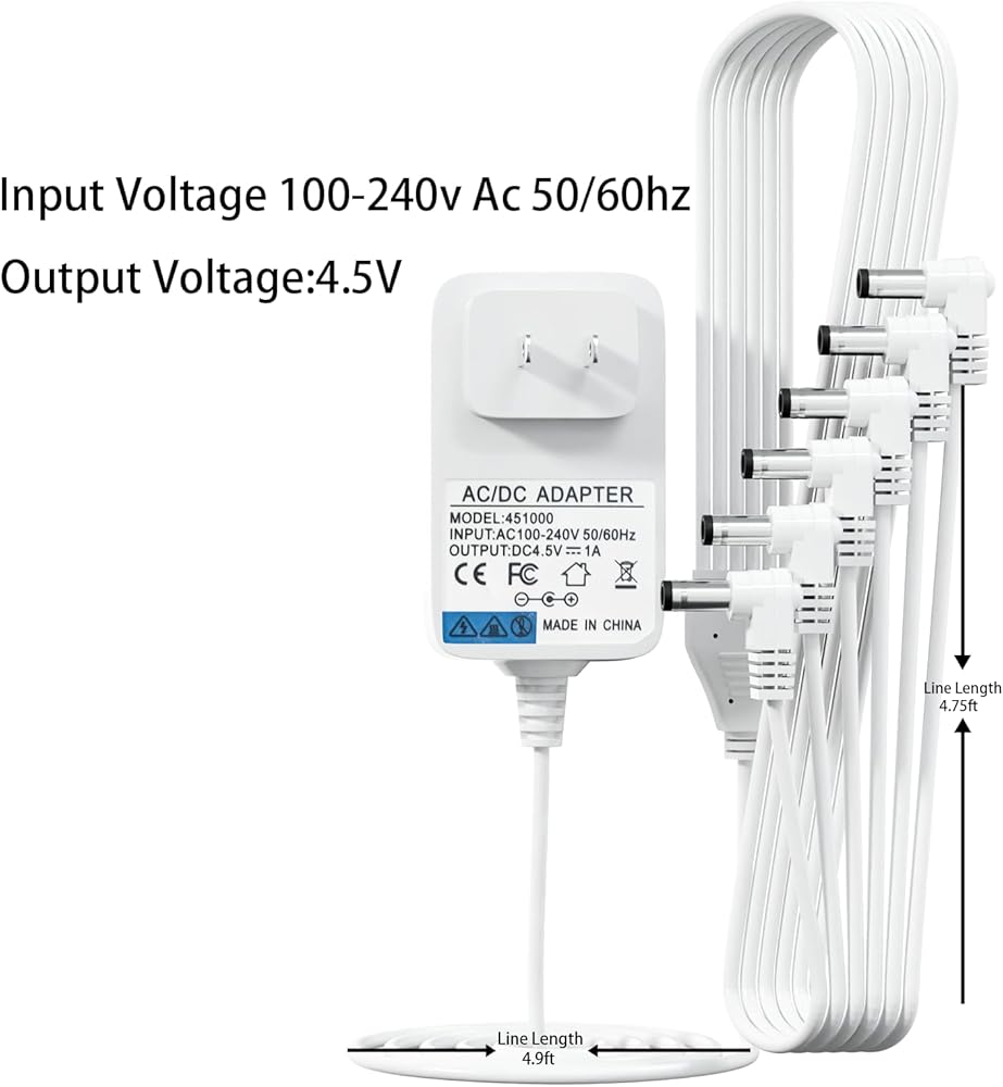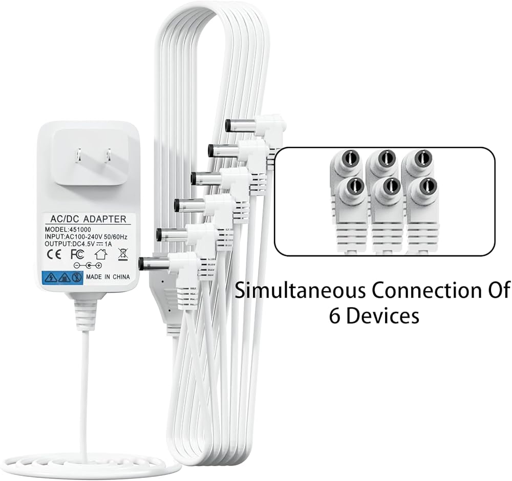 مواصفات المنتج: جهد الإدخال: تيار متردد 100 - 240 فولت 50/60 هرتز، جهد الخرج: 4.5 فولت 1000 مللي أمبير. مزود بـ 6 مخرجات بطول إجمالي يبلغ حوالي 9.84 قدم (3 أمتار)، ويبلغ طول كل خط فرعي 4.92 قدم