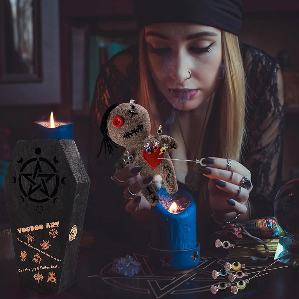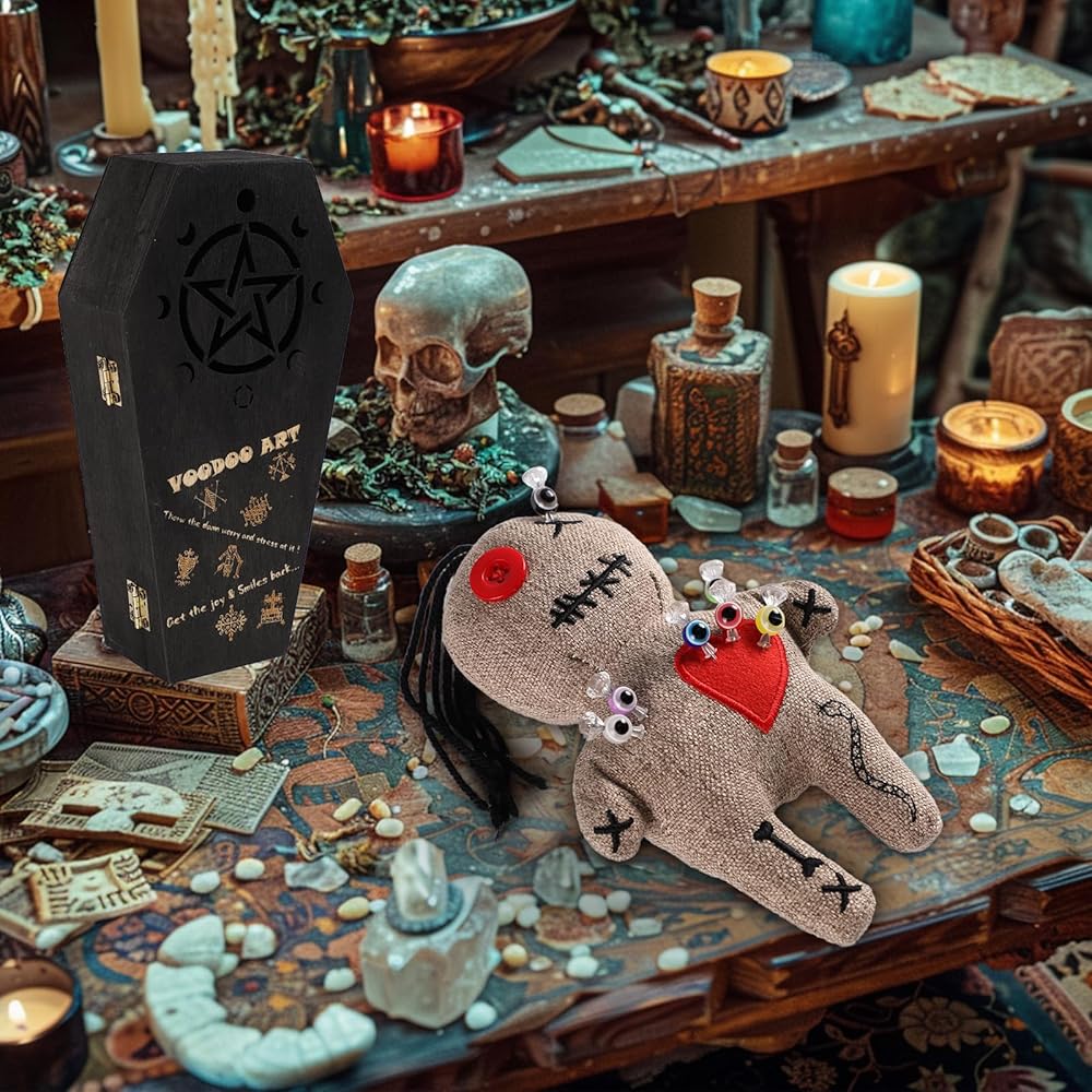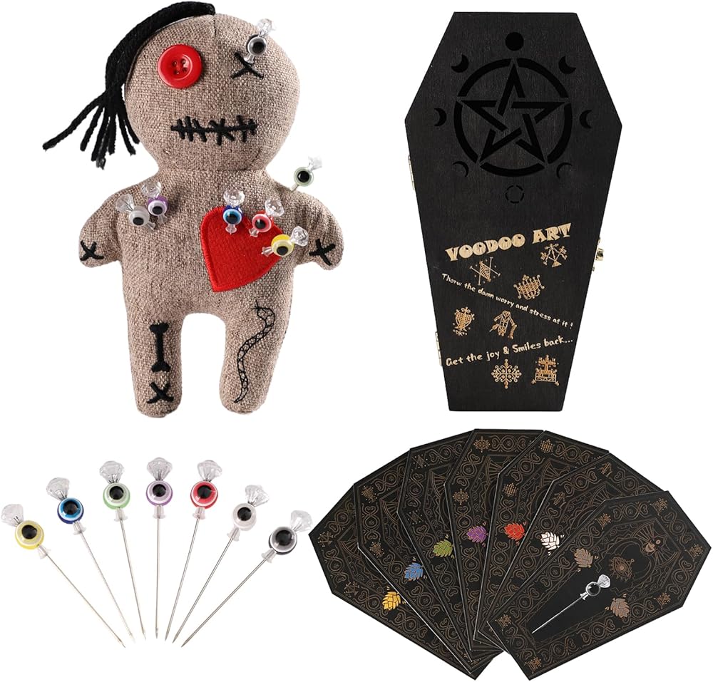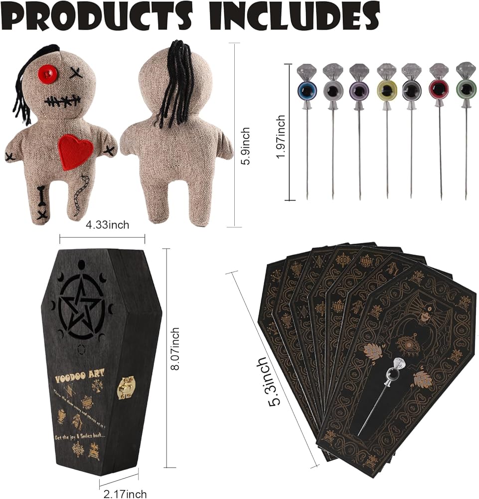 Voodoo Doll Kit:You will receive 1 wooden coffin box,1 creepy doll with a red heart,7 masterfully printed spell cards and 7 spell casting magic pins.