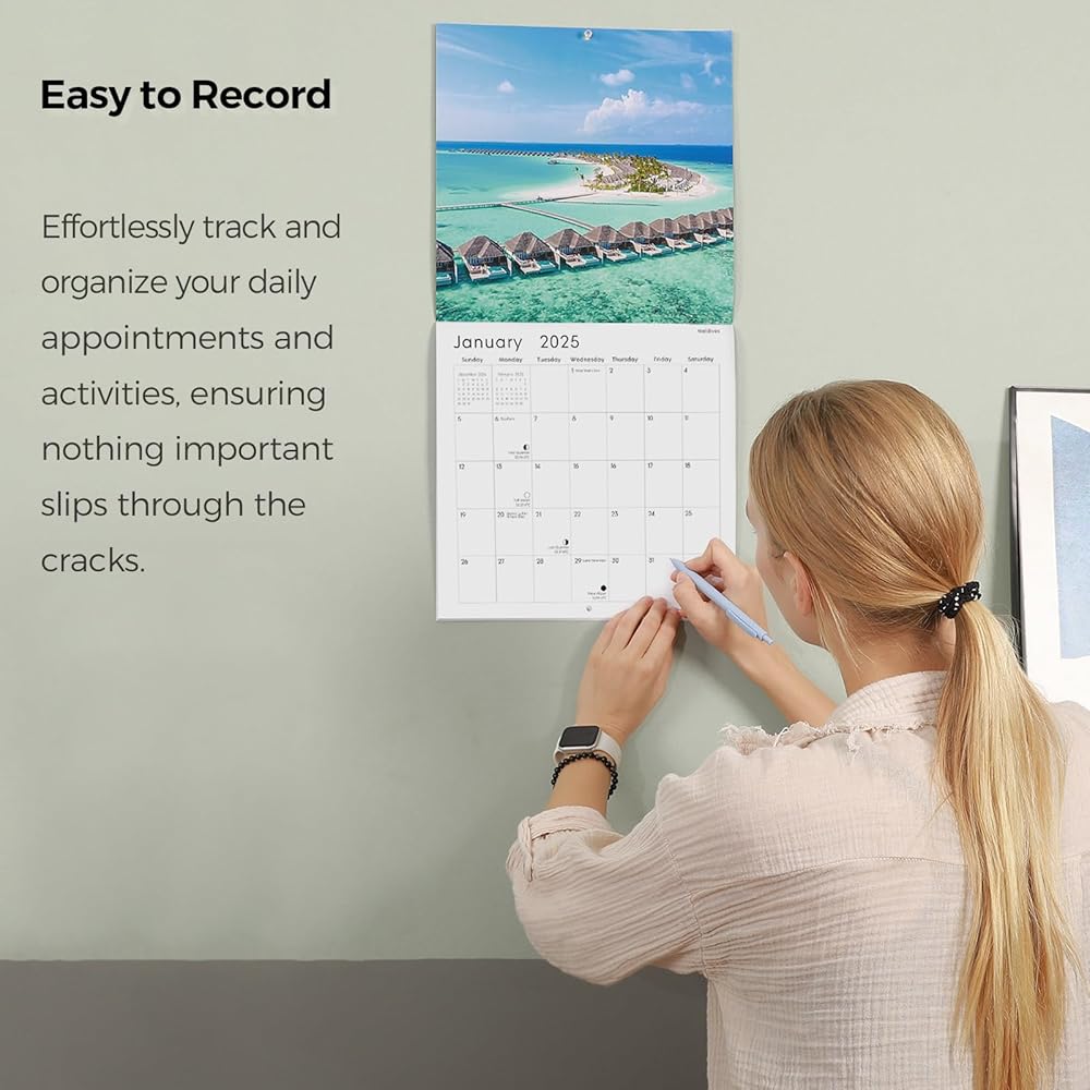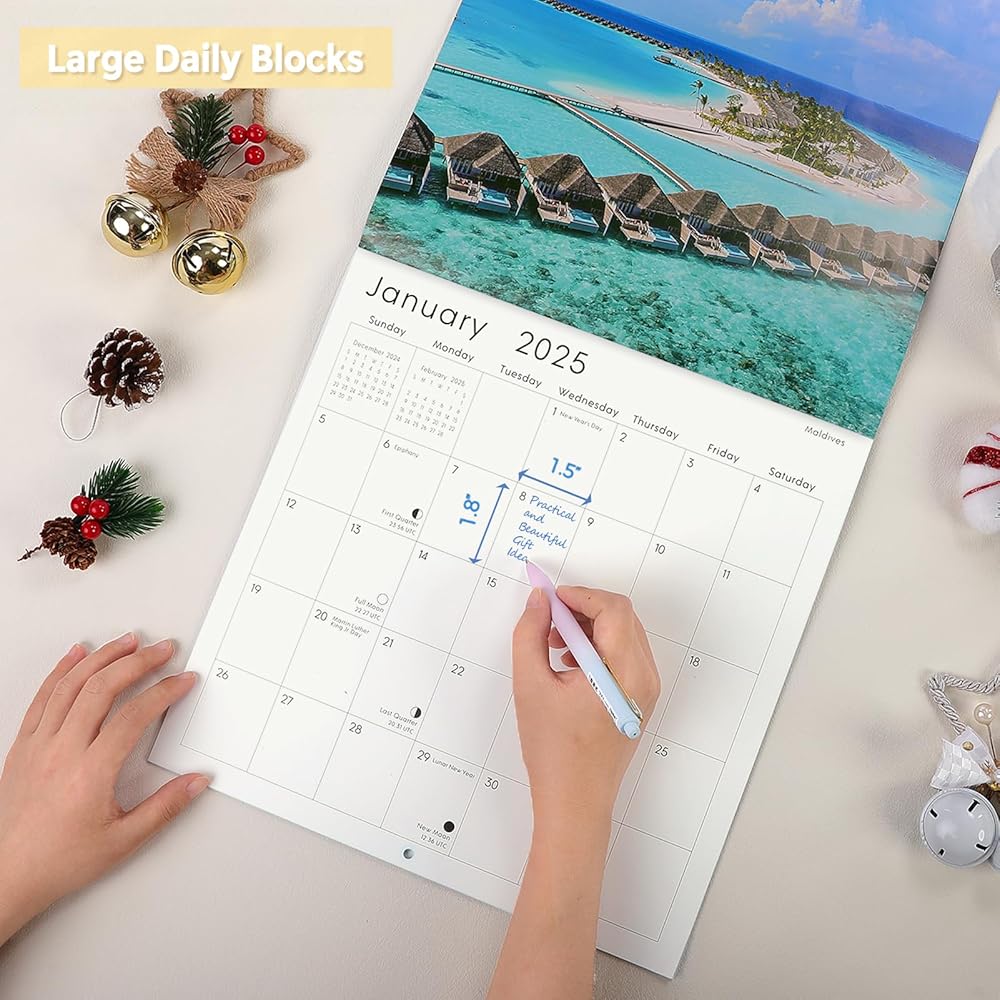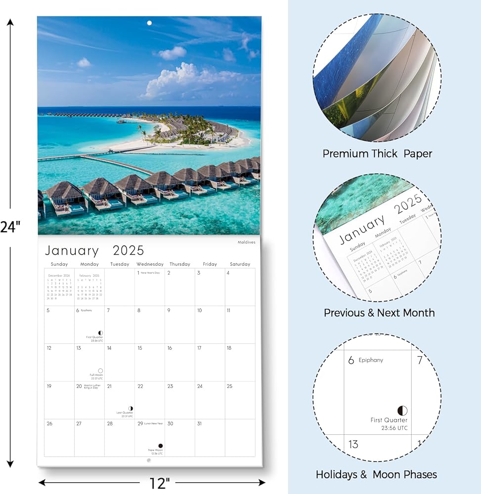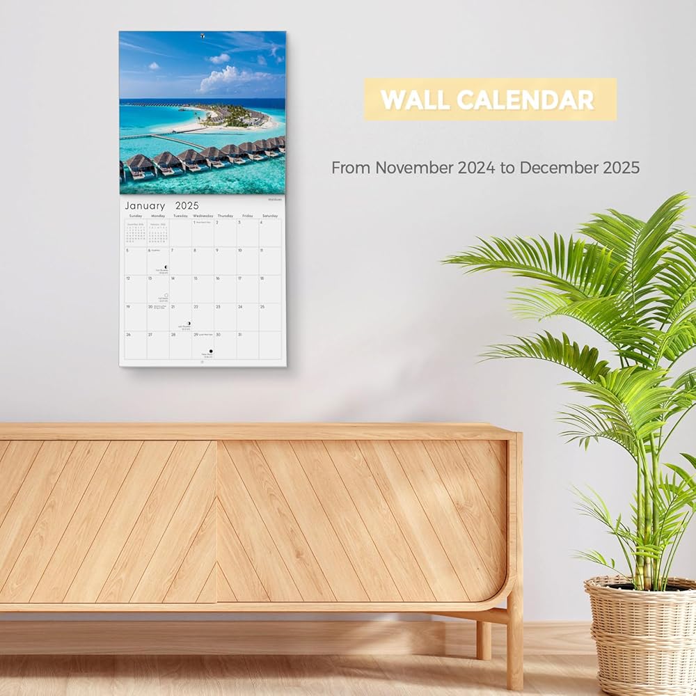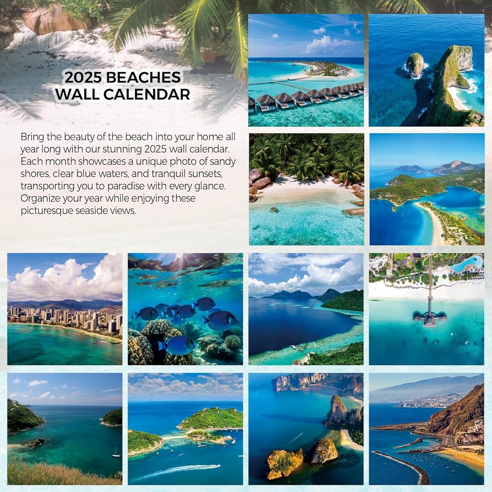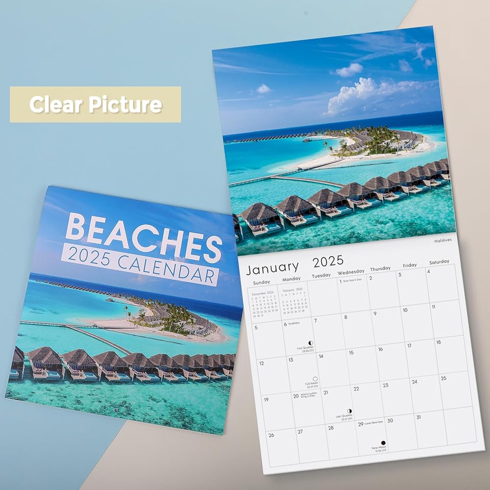 Step into a world of coastal beauty with our beach wall calendar for 2024-2025. This captivating wall calendar spans from November 2024 to December 2025, featuring all major holidays and lunar phases. Each month transports you to stunning beach destinations, adorned with breathtaking landscapes that showcase vibrant blue skies, fluffy white clouds, sparkling waters, and gentle sandy shores framed by lush greenery. More than just a calendar, this exquisite piece serves as a delightful wall decoration. Looking for the perfect gift? This calendar, embellished with enchanting beach photography, is not only beautiful but also practical, making it an ideal gift for friends and family for the New Year or Christmas. Elevate your scheduling experience with our 2025 beach wall calendar —where organization meets coastal charm!