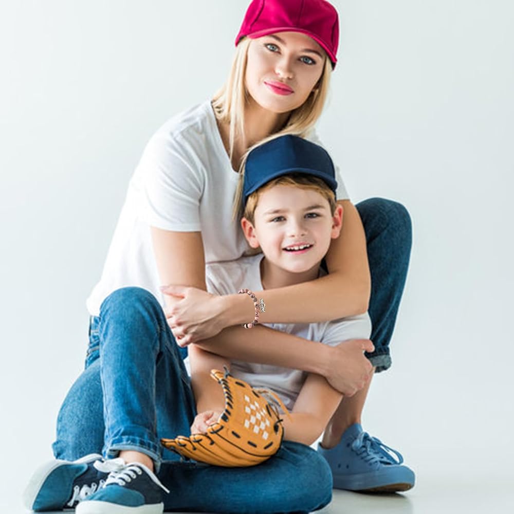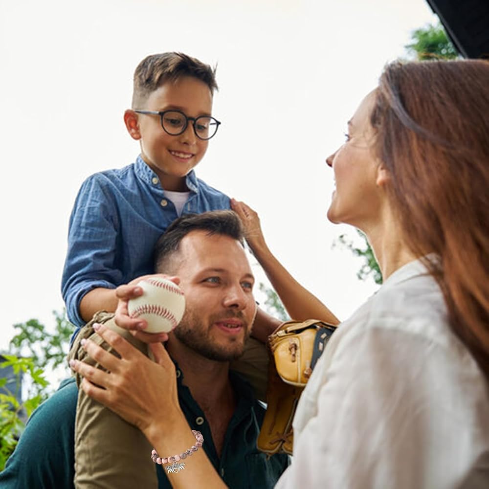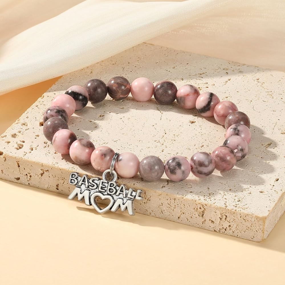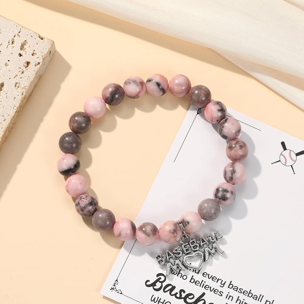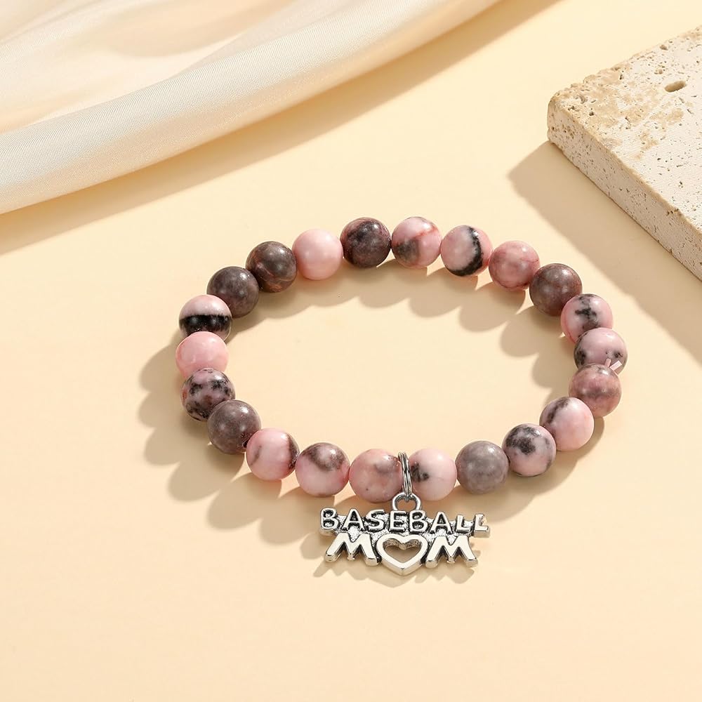 • *Baseball Mom Charm Bracelet in Pink* The beads of the bracelet are made of natural bean paste-colored stones, each stone beads have a unique color and pattern. The bracelet is designed with elastic rope, not easy to break, beaded bracelets are suitable for most mama's wrists. Inspiring every mom wearer's inner champion. As a encourage present for your mom.