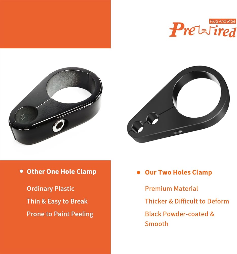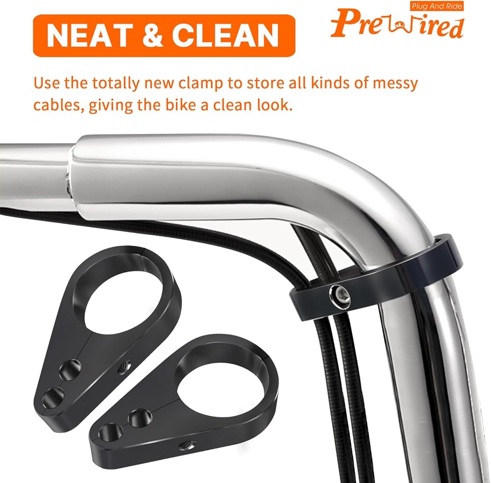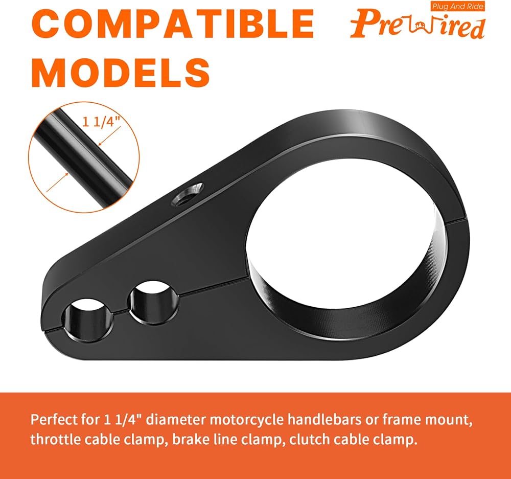 قائمة الإعداد: يناسب قطر 1 1/4 بوصة (1.25 بوصة) هارلي وياماها وغيرها من مقود الدراجات النارية أو حامل الإطار، ومشبك كابل الخانق، ومشبك خط الفرامل، ومشبك كابل القابض.