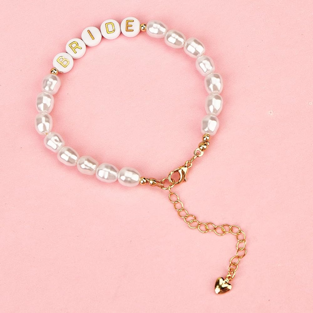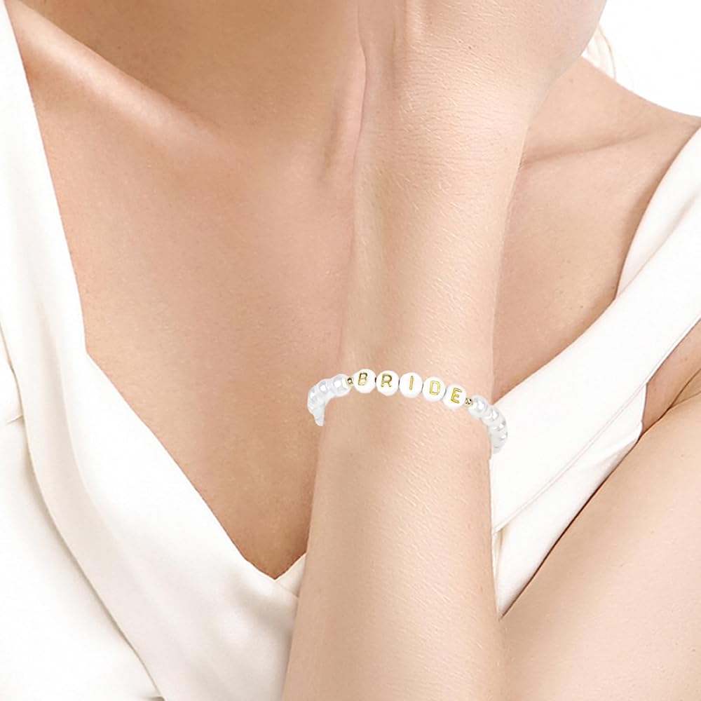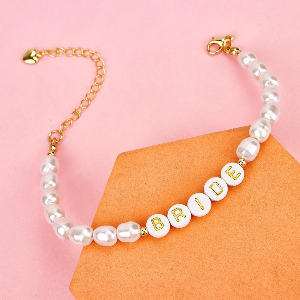 【سوار العروس الأنيق】سوار العروس الخاص بنا لحفلات الزفاف مزين باللؤلؤ الصناعي من المياه العذبة وحروف "BRIDE" ذهبية، خالدة مثل حبك وسعيدتك. سوار زفاف أنيق، بمجرد ارتدائه، ستكون مركز الاهتمام في حفلات توديع العزوبية وحفلات الزفاف.