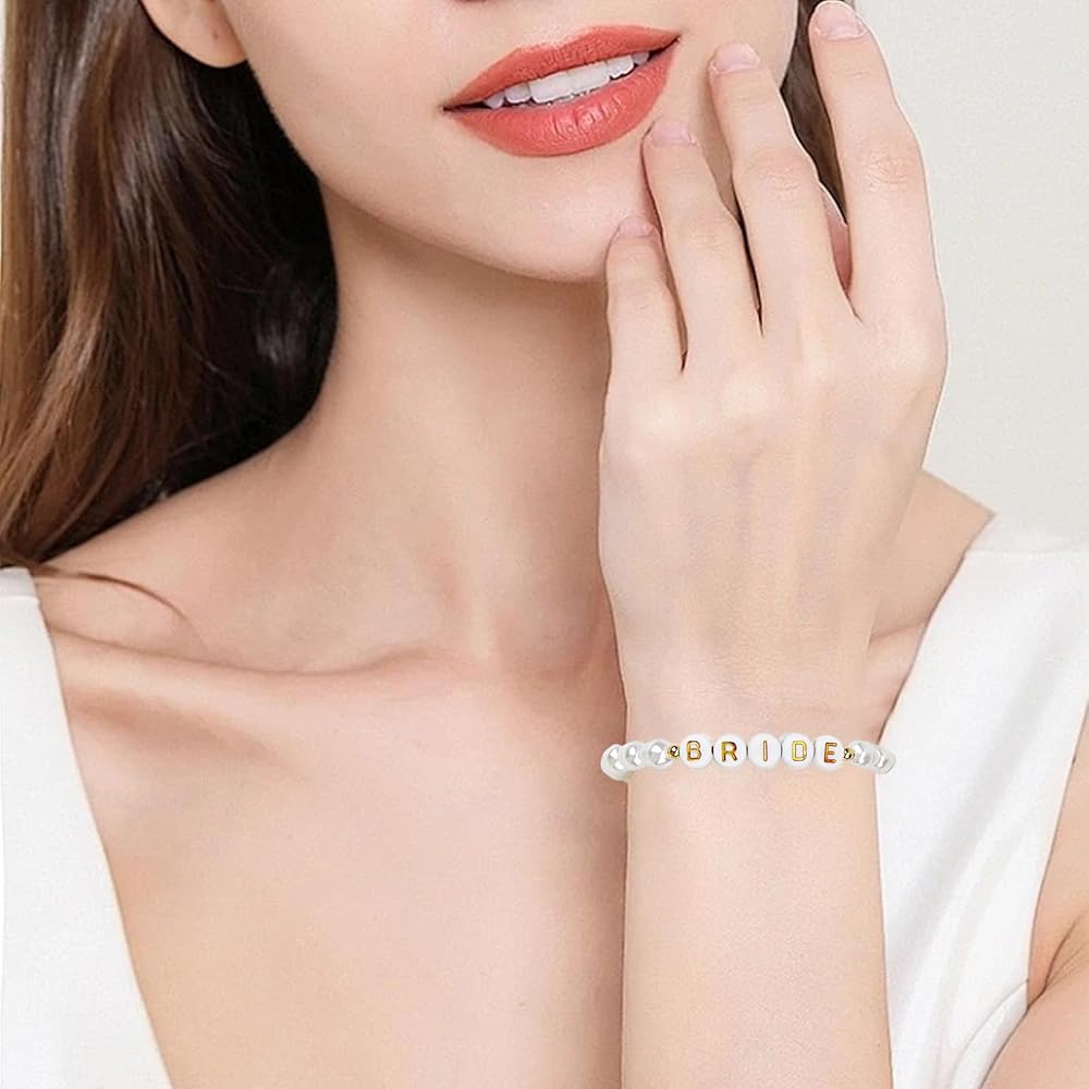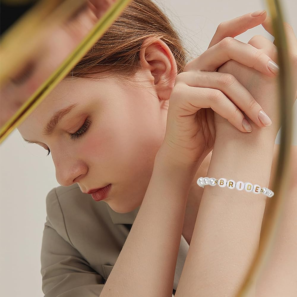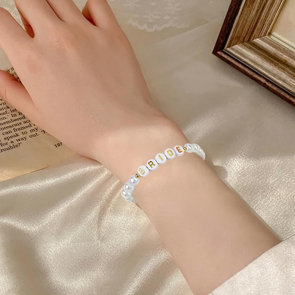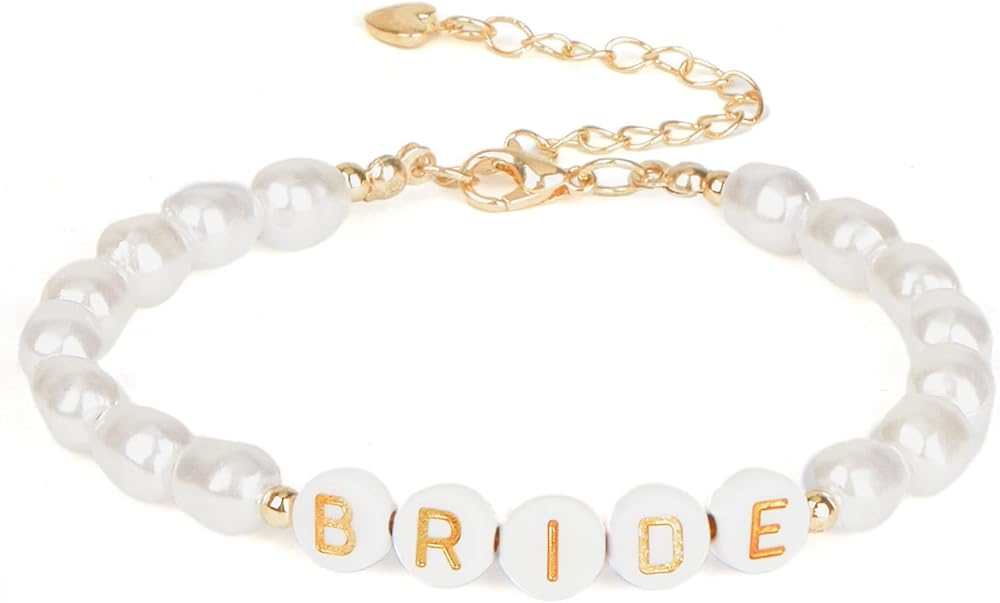 【سوار العروس الأنيق】سوار العروس الخاص بنا لحفلات الزفاف مزين باللؤلؤ الصناعي من المياه العذبة وحروف "BRIDE" ذهبية، خالدة مثل حبك وسعيدتك. سوار زفاف أنيق، بمجرد ارتدائه، ستكون مركز الاهتمام في حفلات توديع العزوبية وحفلات الزفاف.