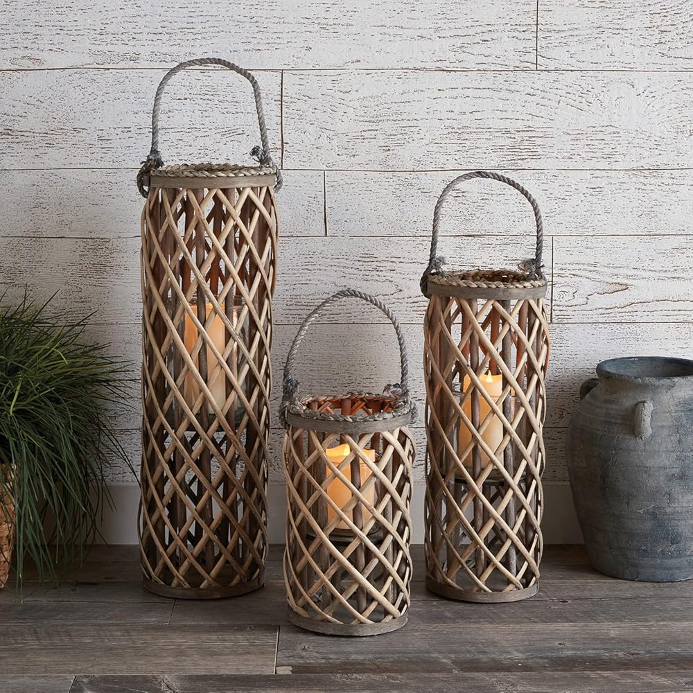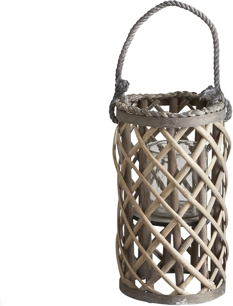 CYLINDER LANTERN CANDLE HOLDER; Slim design with rope handle and glass insert; adds beach house vibes to your home décor