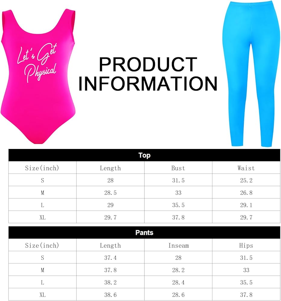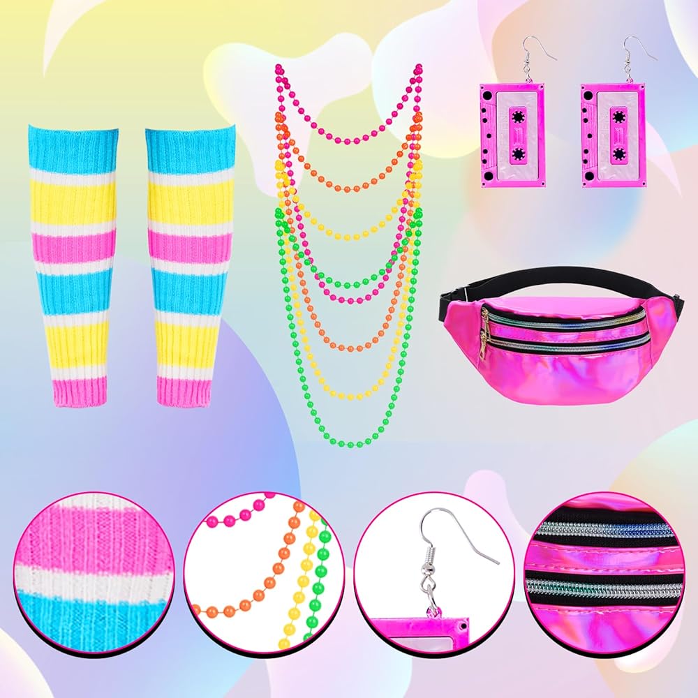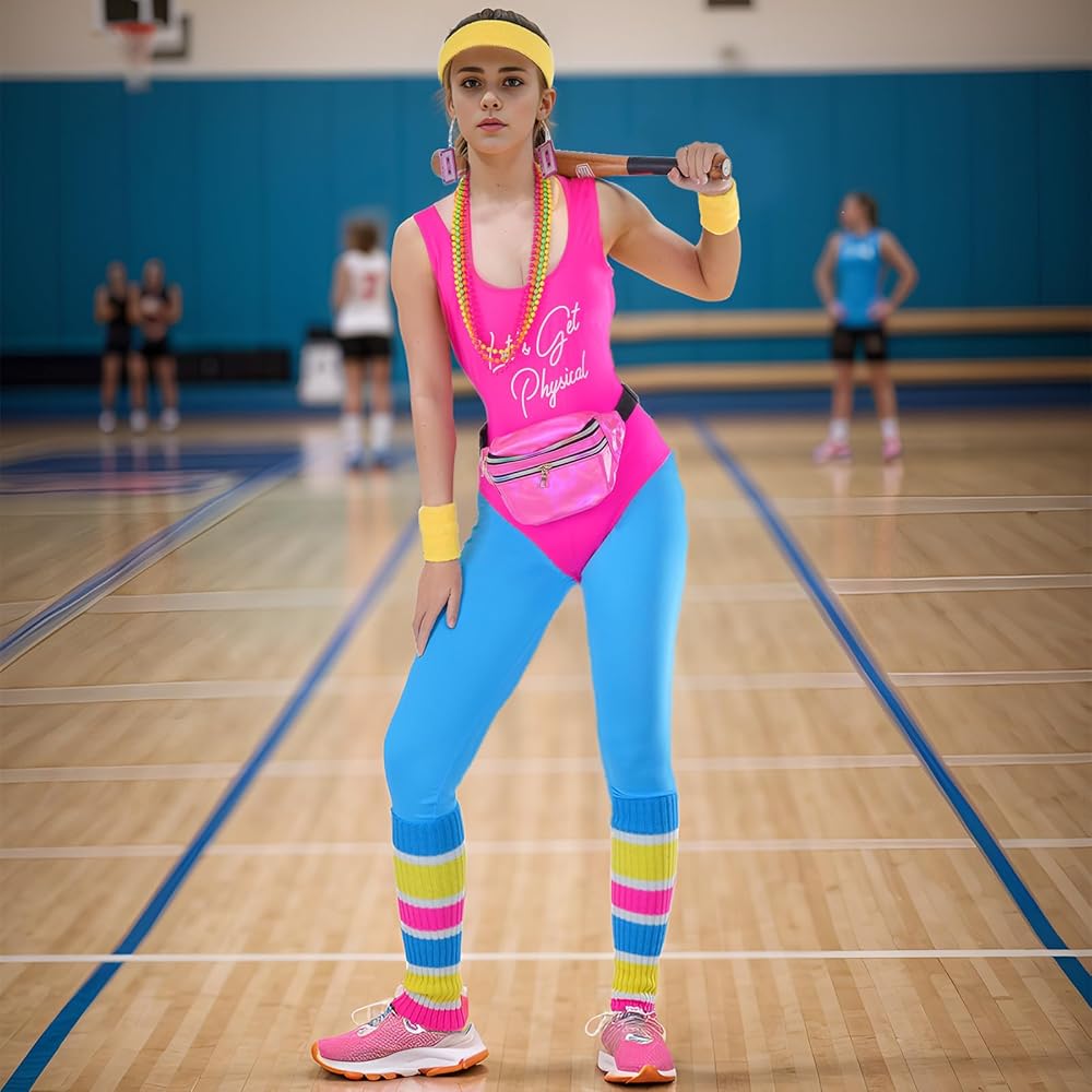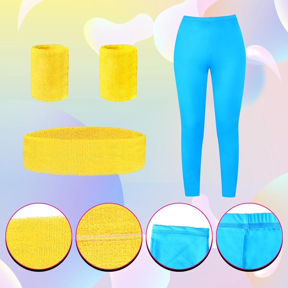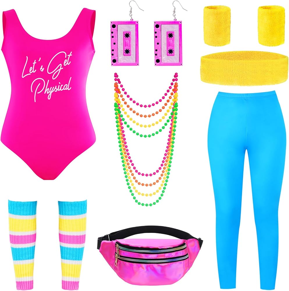 مجموعة أزياء التمرين في الثمانينيات: تتضمن مجموعة أزياء التمرين في الثمانينيات قطعة واحدة من ملابس السباحة، وزوجًا واحدًا من سراويل اليوجا، وزوجًا واحدًا من تدفئة الساق، وقطعة واحدة من عصابة الرأس، وزوجًا واحدًا من أساور المعصم، وزوجًا واحدًا من الأقراط وقطعة واحدة من العبوة، بما يكفي تلبي احتياجاتك من إكسسوارات أزياء الثمانينيات.